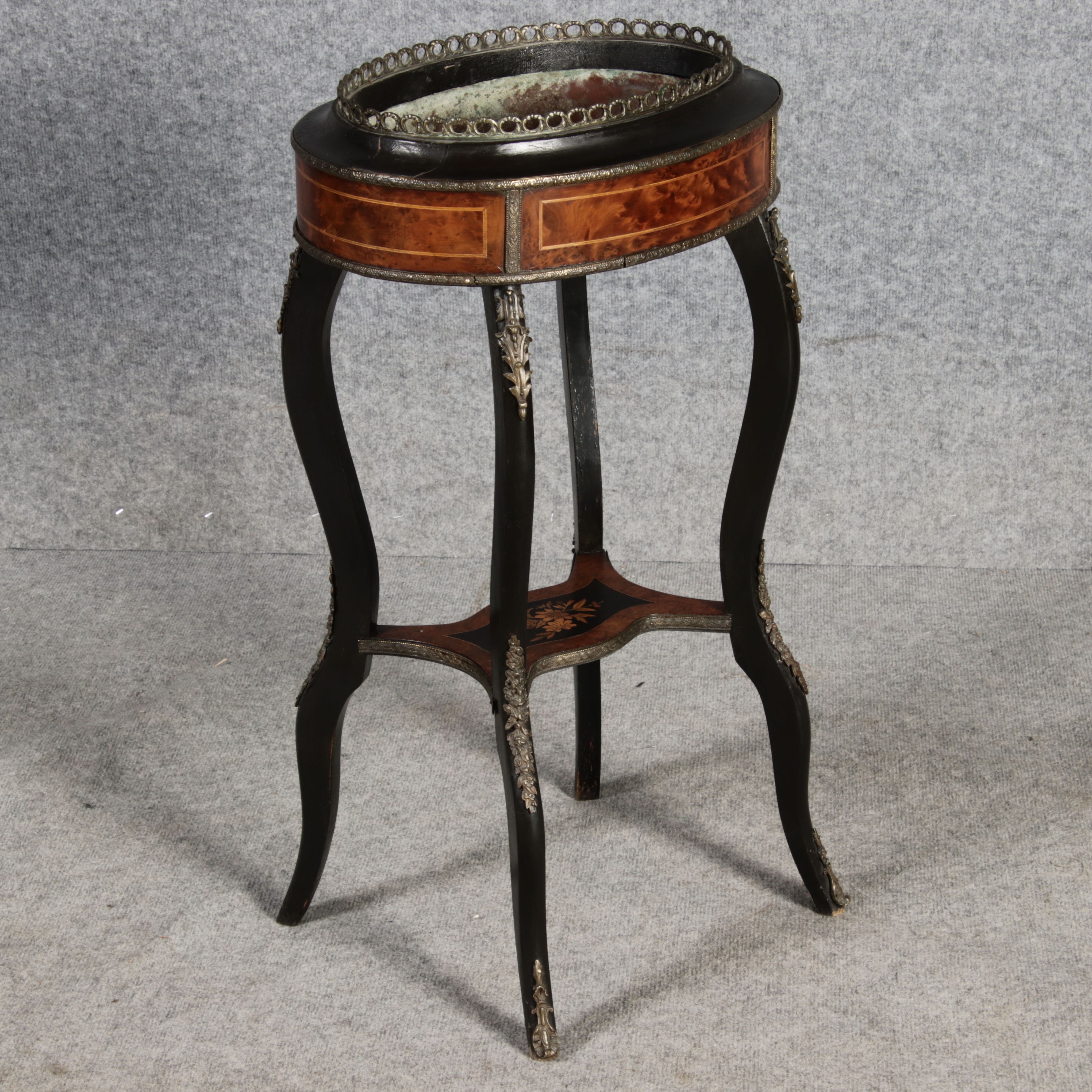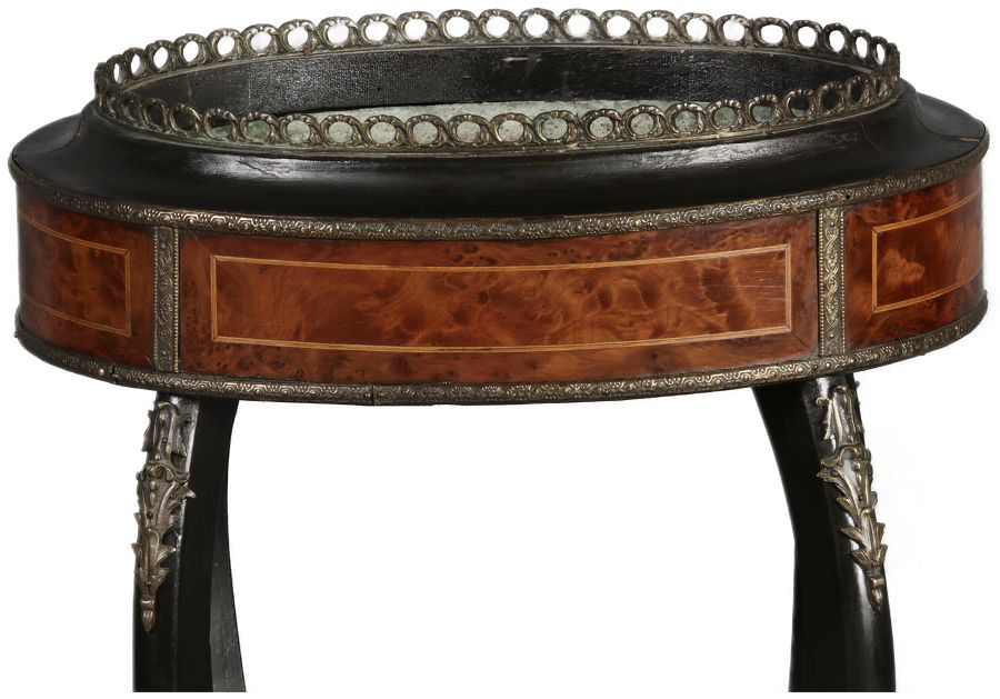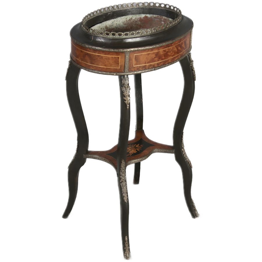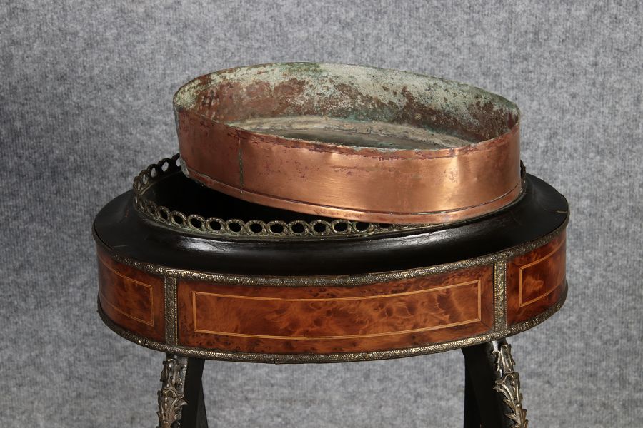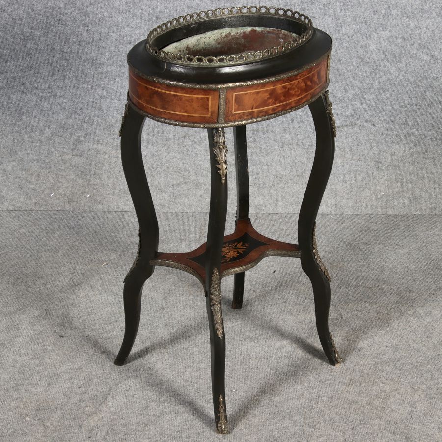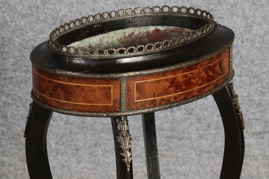 2. Drittel 19. Jh., mittels Mahagoni- und tw. eingefärbten Obsthölzern vermarktetes Hartholzgestell i. ovale Form, ebonisiertes Gestell i. geschweift. Ausführung, mit Blechwanne f. Blumen, Zwischenablage, Bronzezierbeschlag, Furnierfehlstellen, Alters- u. Gebr. spuren. |