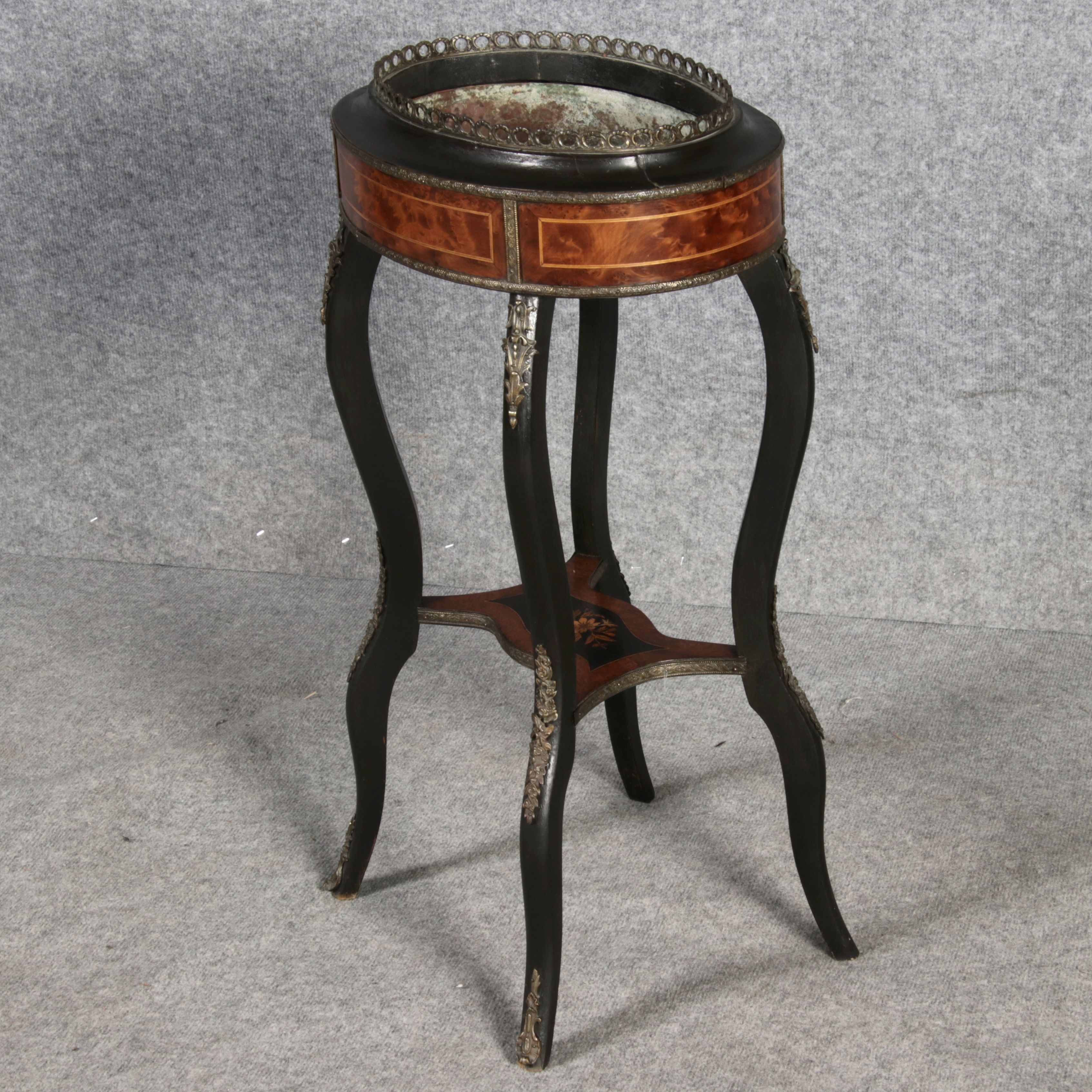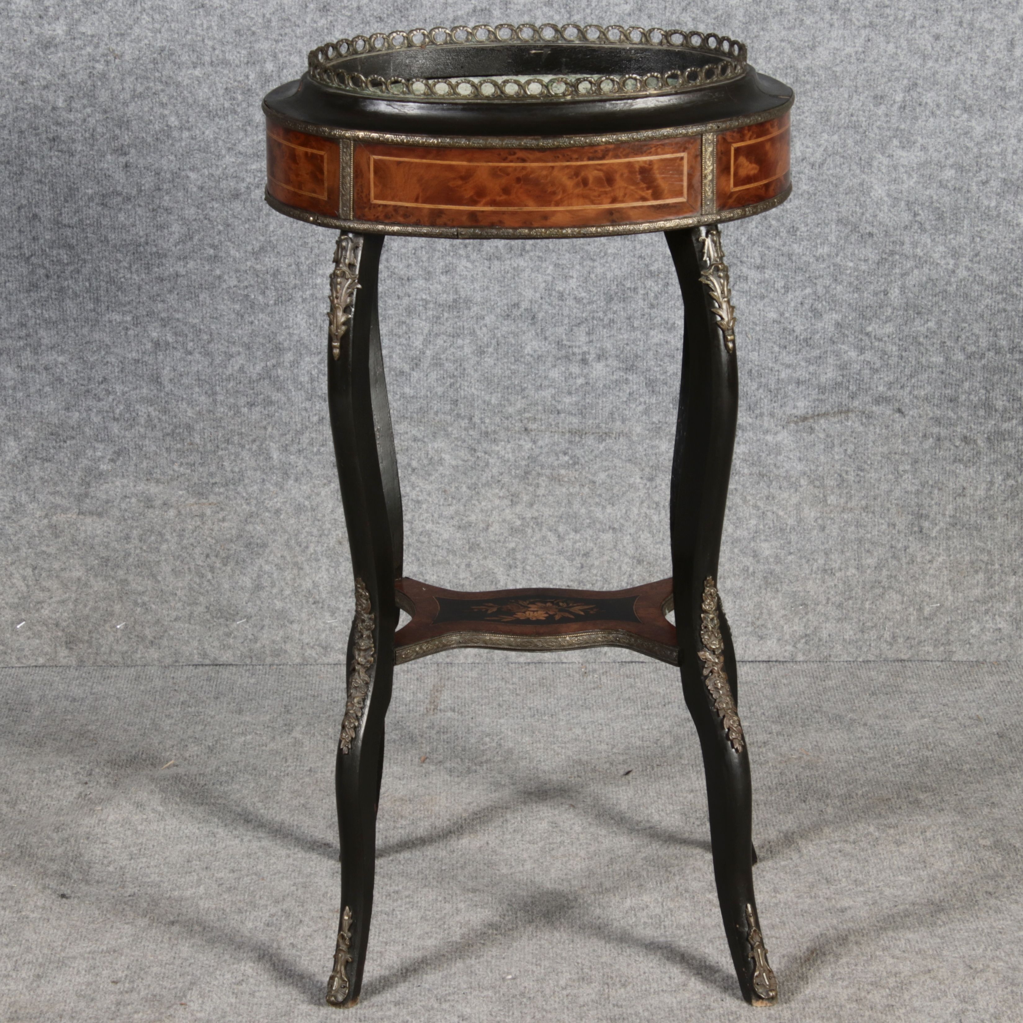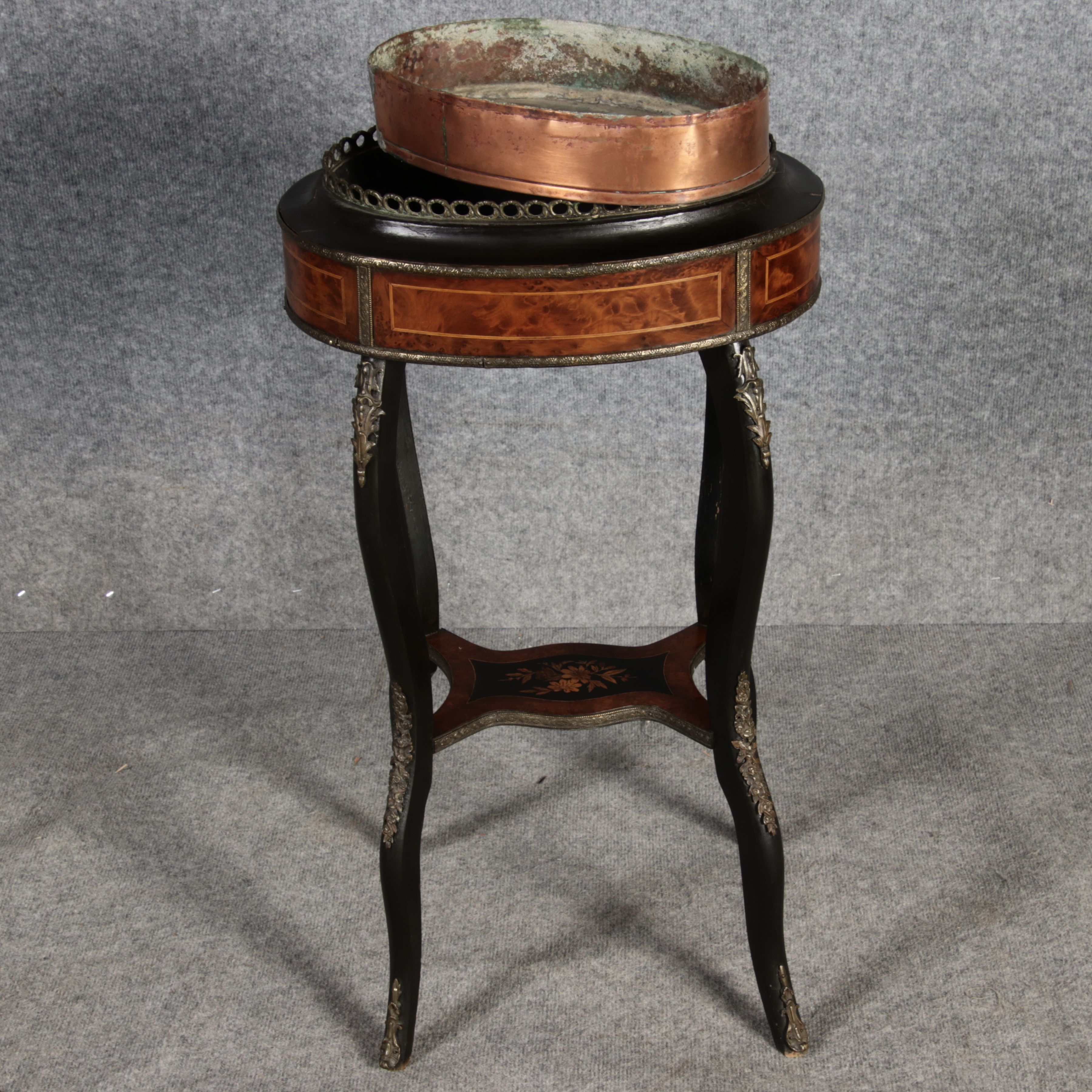 2. Drittel 19. Jh., mittels Mahagoni- und tw. eingefärbten Obsthölzern vermarktetes Hartholzgestell i. ovale Form, ebonisiertes Gestell i. geschweift. Ausführung, mit Blechwanne f. Blumen, Zwischenablage, Bronzezierbeschlag, Furnierfehlstellen, Alters- u. Gebr. spuren. |