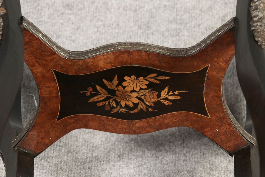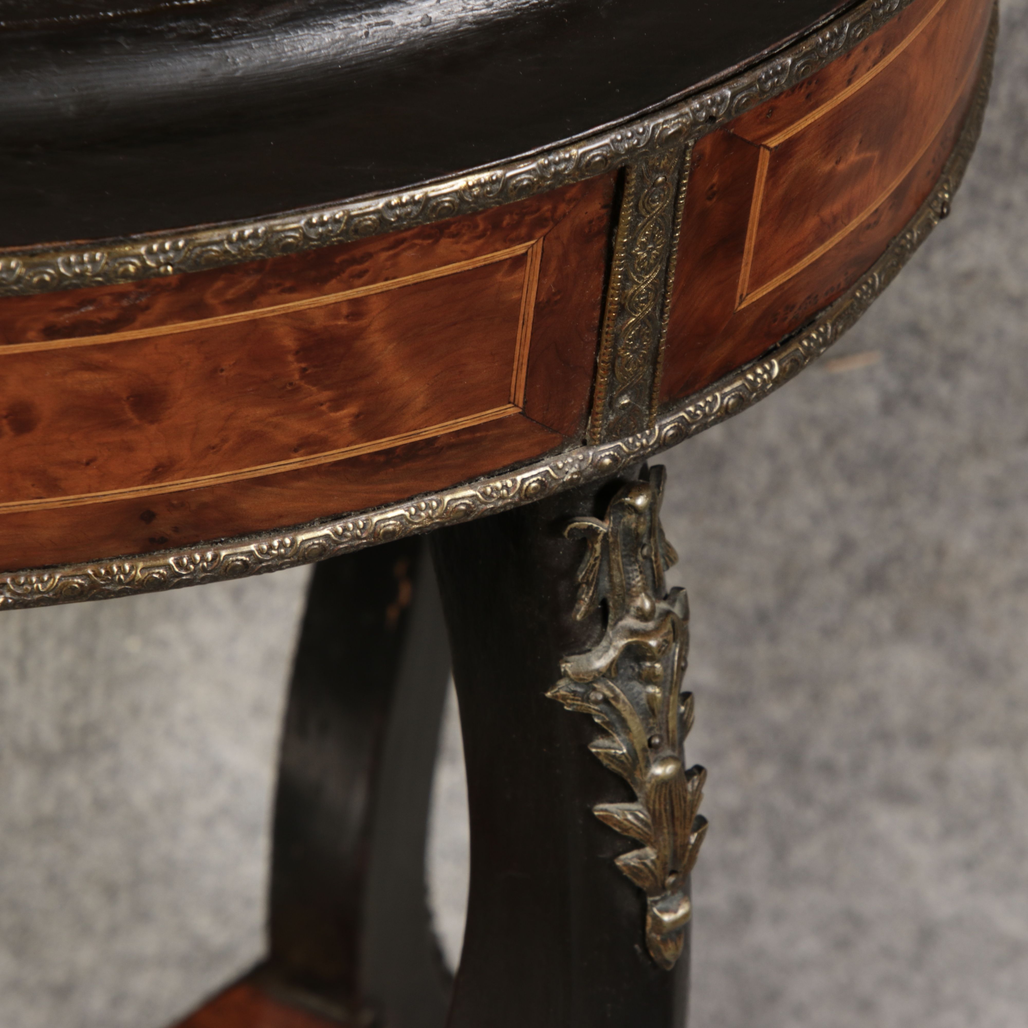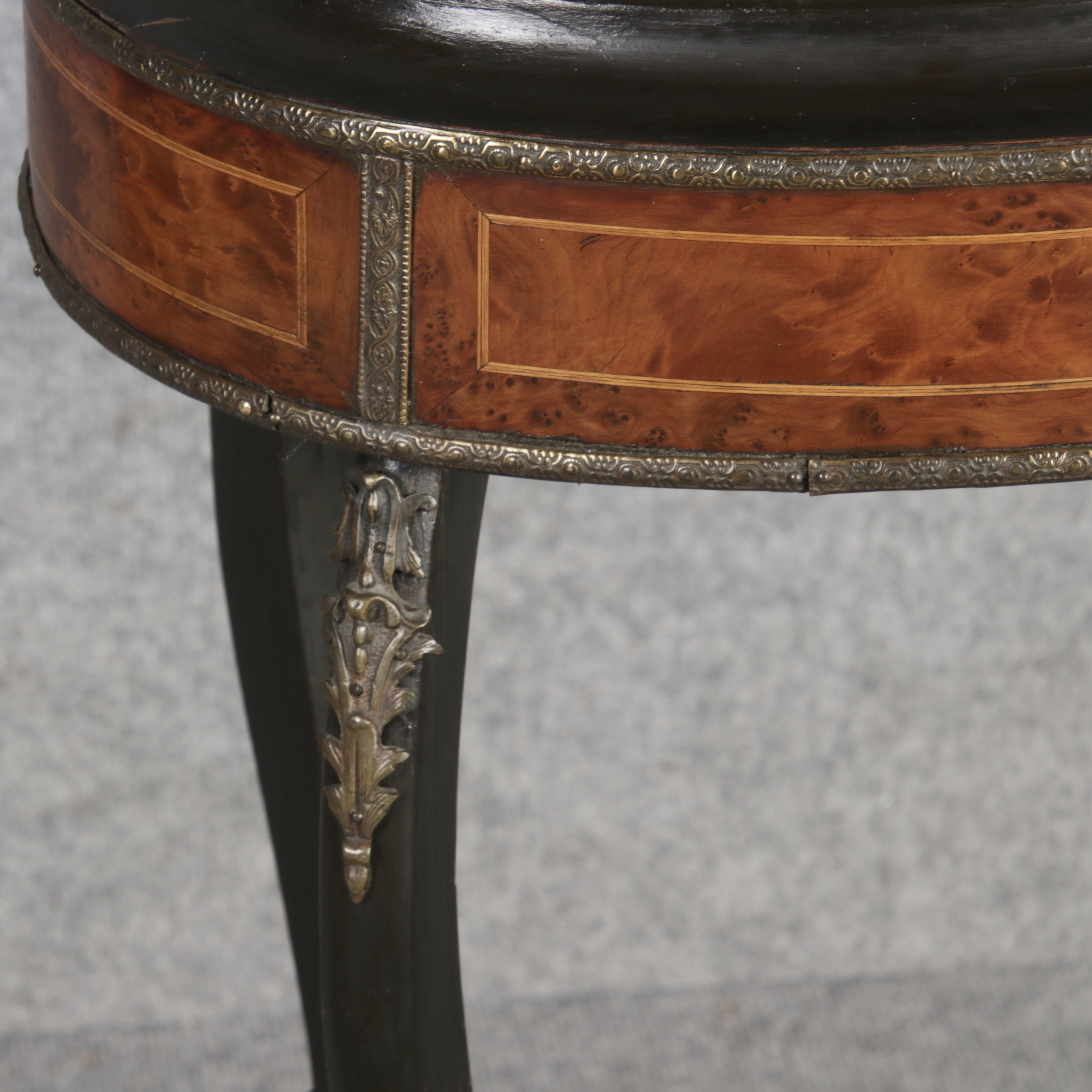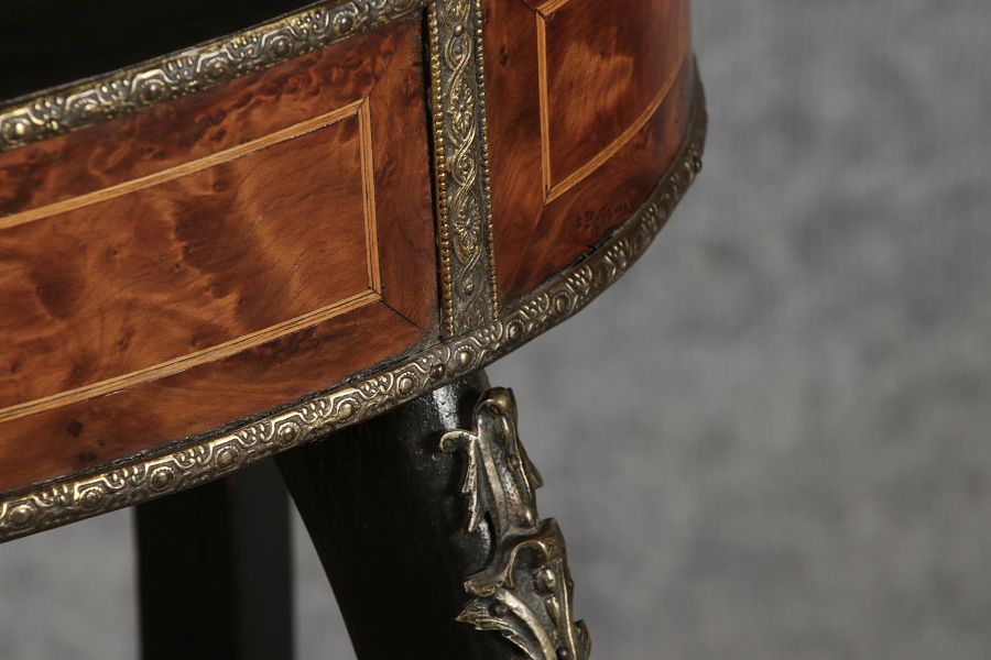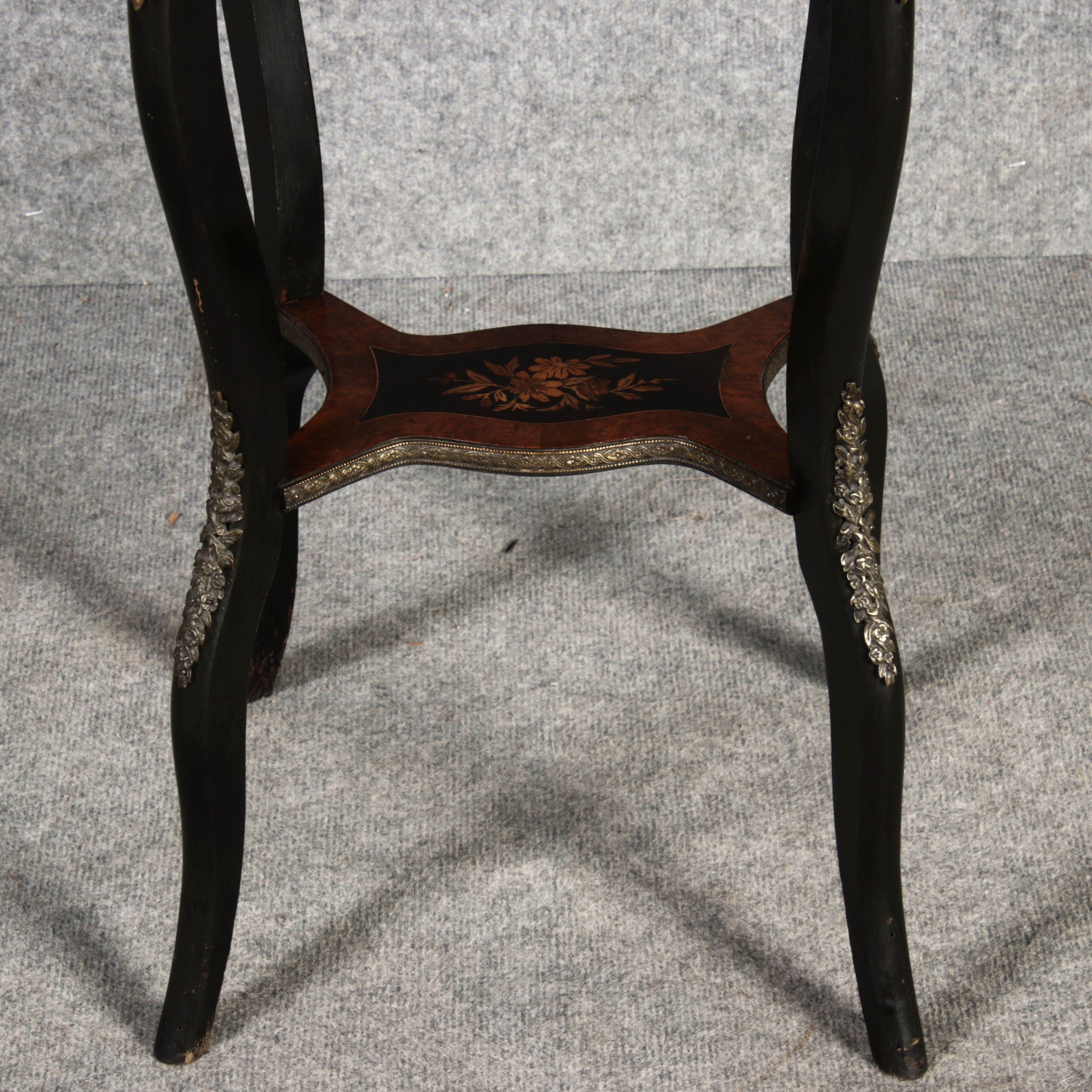 2. Drittel 19. Jh., mittels Mahagoni- und tw. eingefärbten Obsthölzern vermarktetes Hartholzgestell i. ovale Form, ebonisiertes Gestell i. geschweift. Ausführung, mit Blechwanne f. Blumen, Zwischenablage, Bronzezierbeschlag, Furnierfehlstellen, Alters- u. Gebr. spuren. |