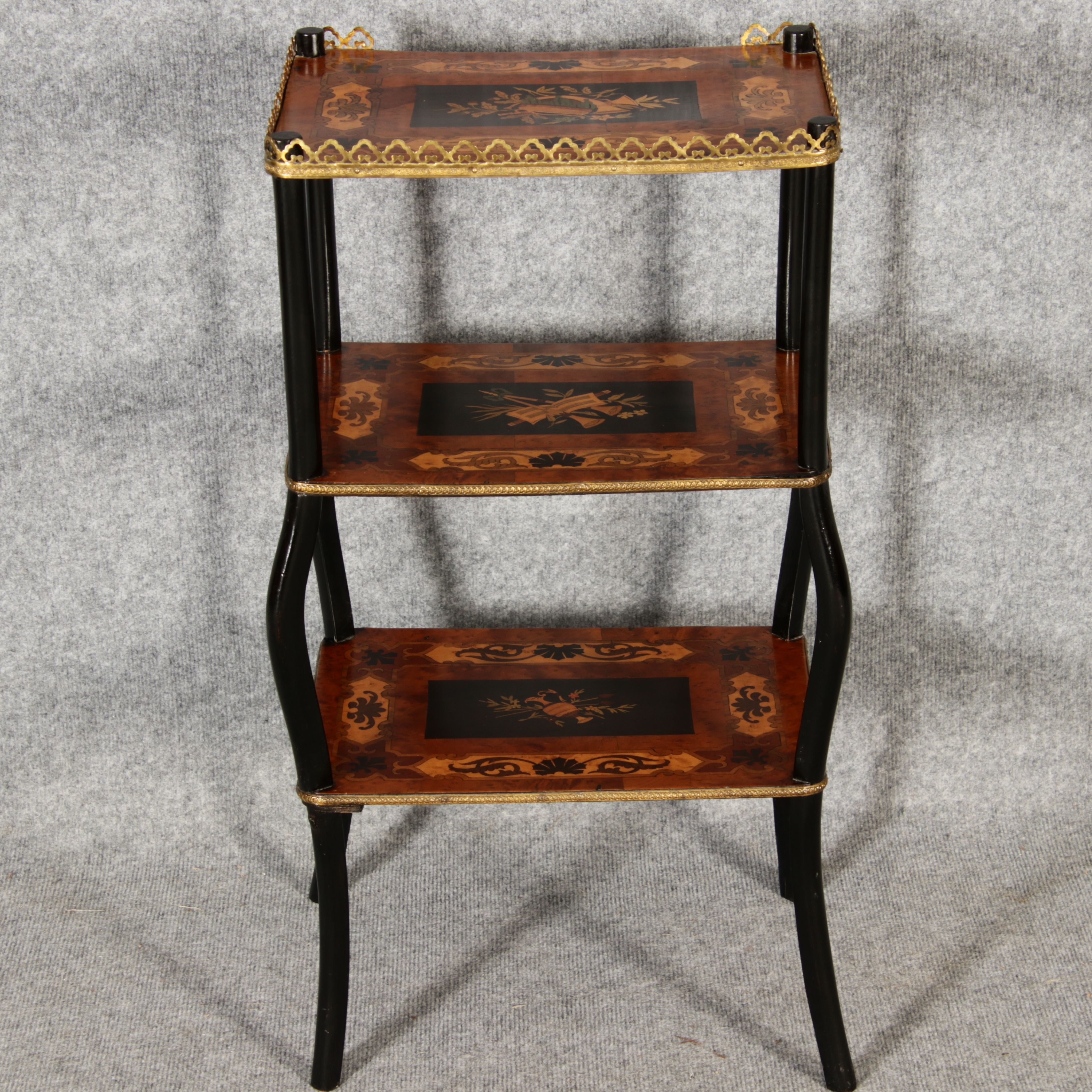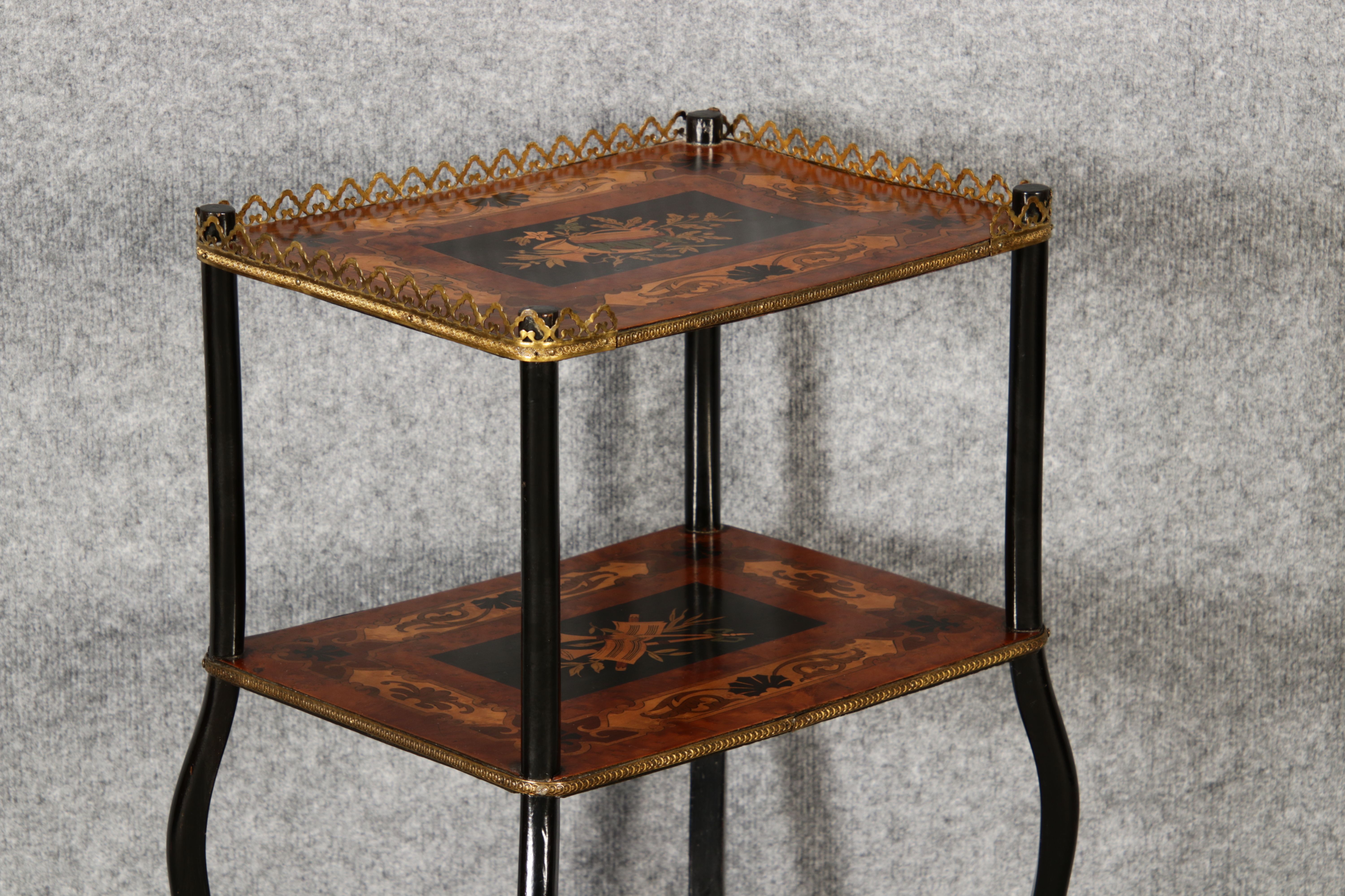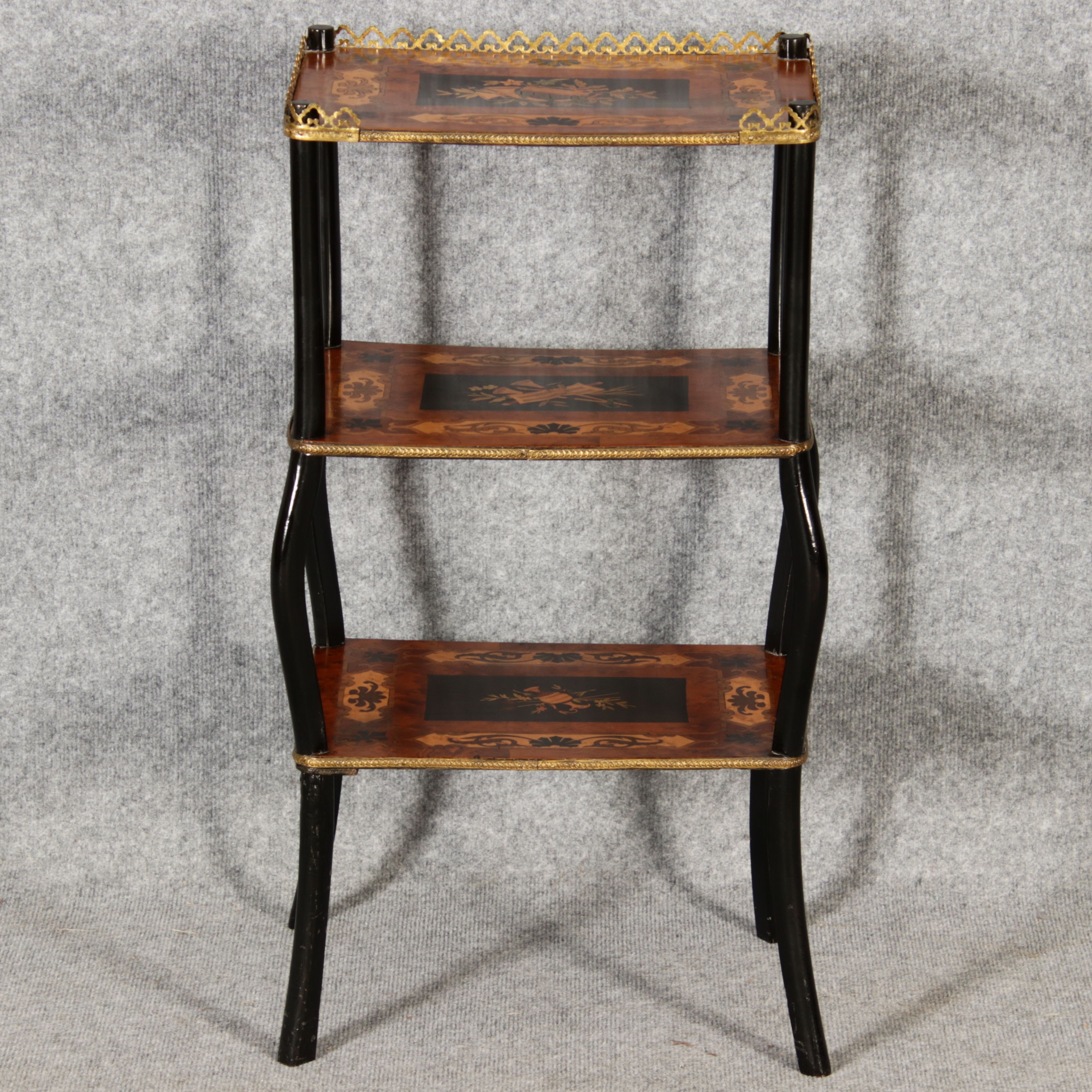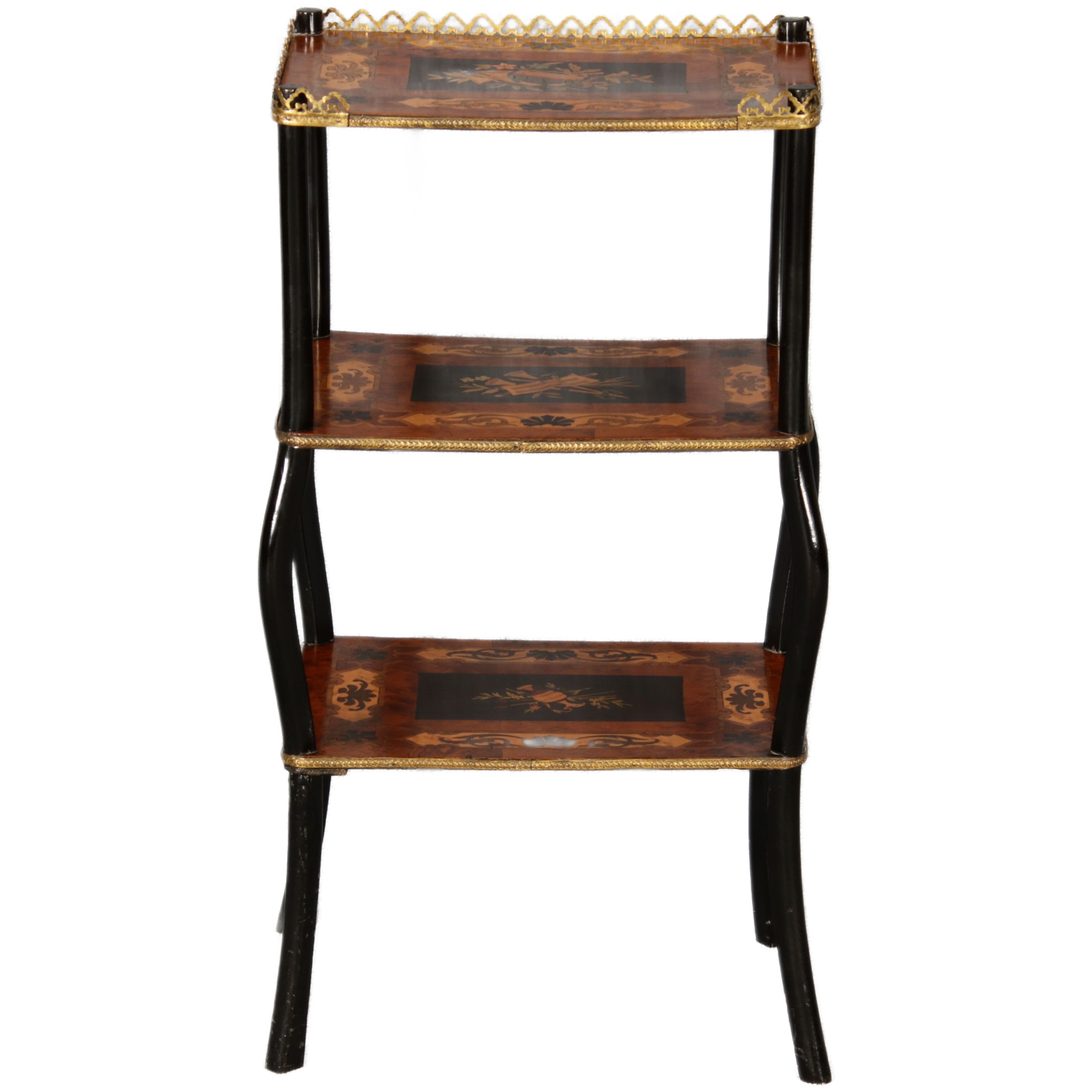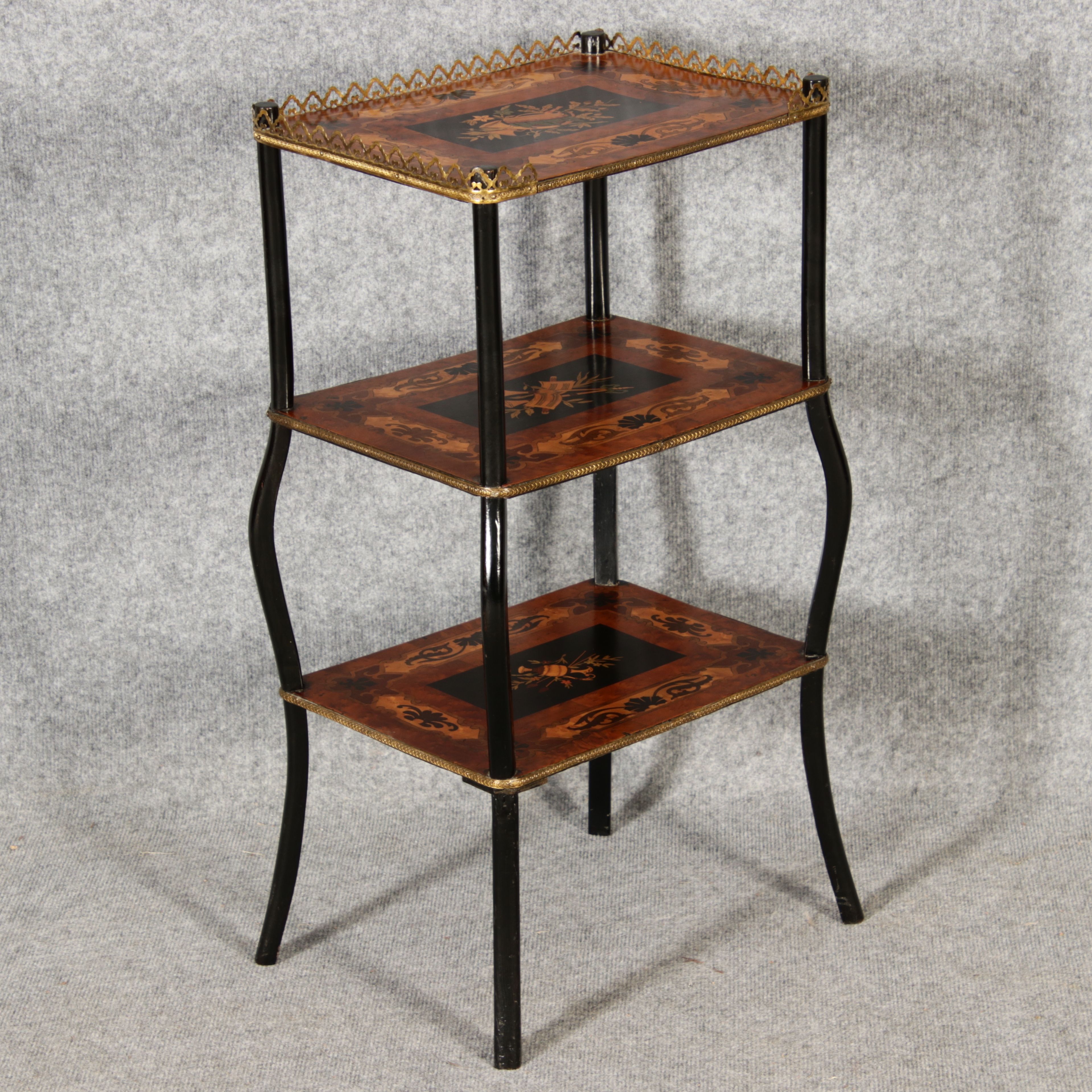 Antike viktorianische französische Etagere aus dem 19 Jh. mit Intarsien einer durchbrochenen Galerie aus Messing, die drei Intarsierten Ablagen sind verziert mit verschiedenen eingelegten Darstellungen und verbunden durch geschwärzte Stützen und Beine. | ||