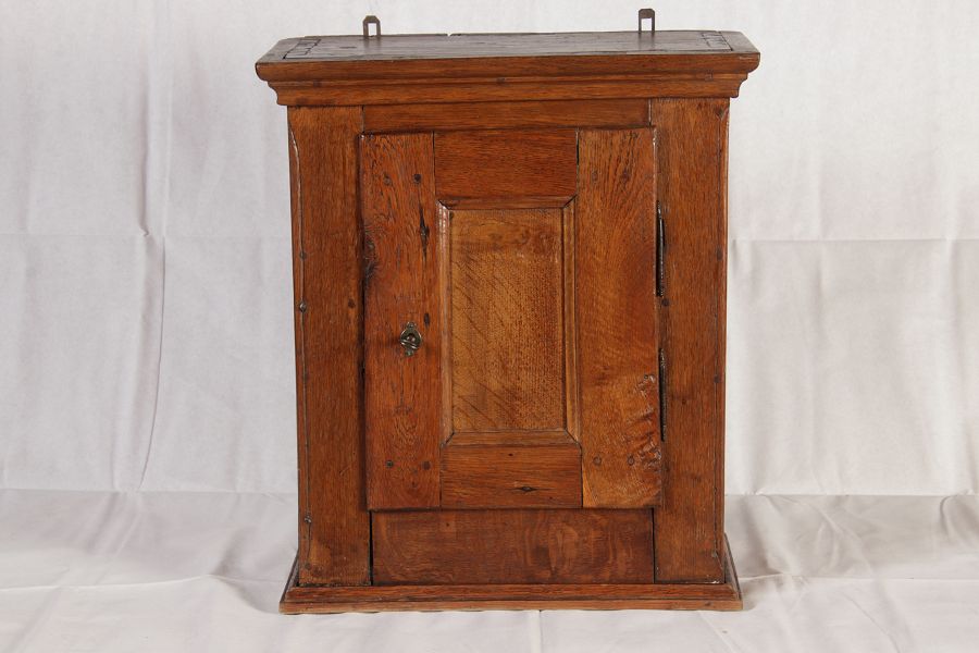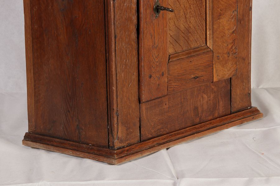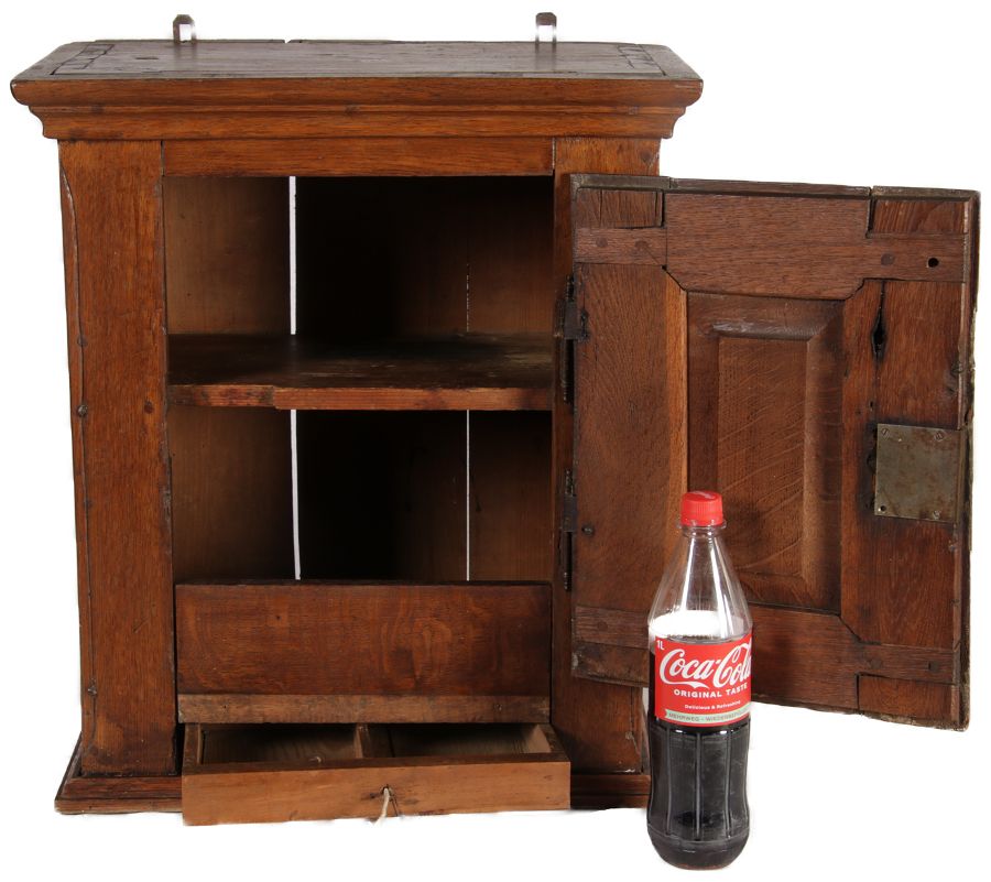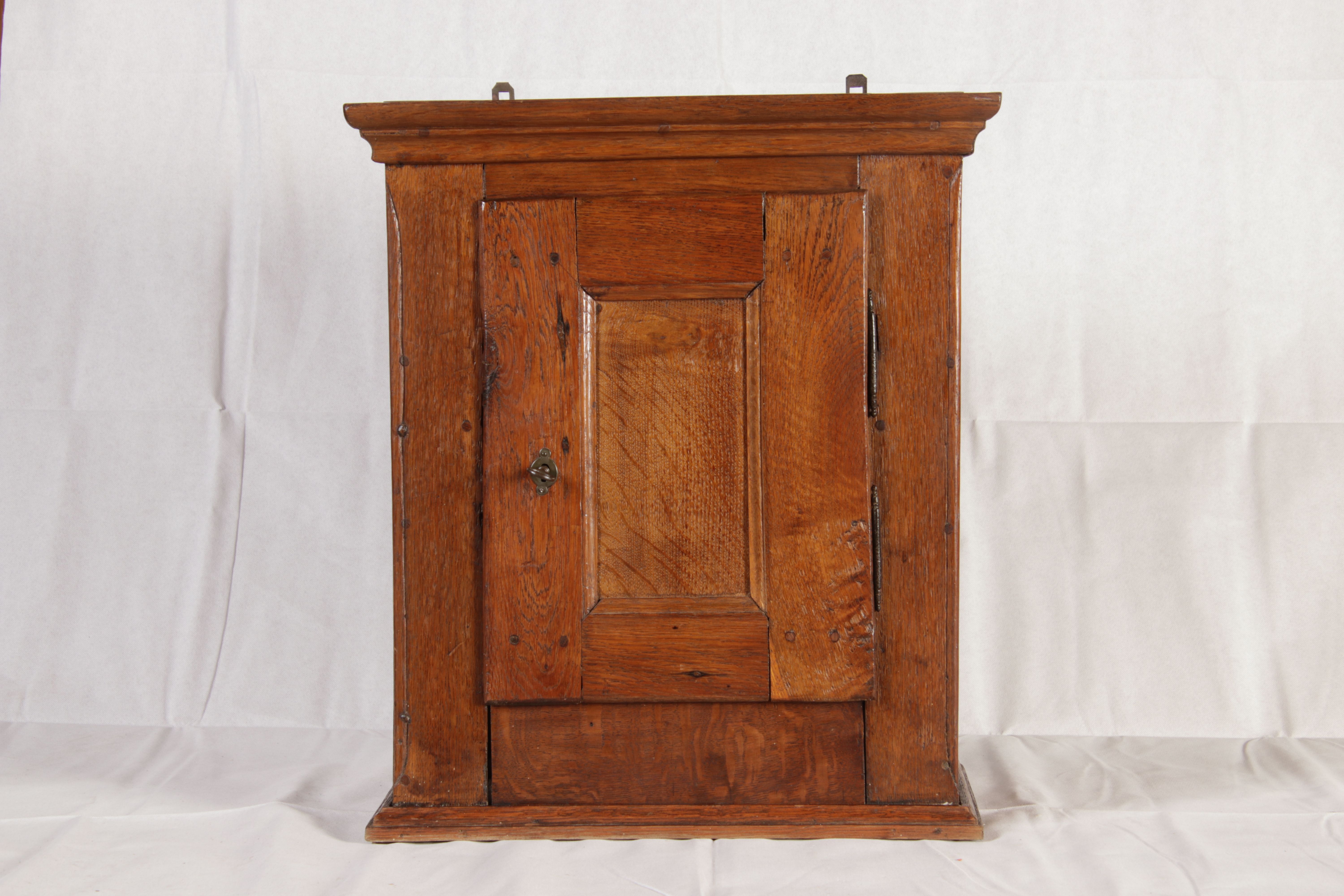 Masse/dimensions: Höhe/Height ca. 61 cm, Breite Korpus/Broad Boda ca. 47 cm, Breite Gesims/Broad cornice ca. 52 cm, Tiefe Korpus/Deep body ca. 24 cm, Tiefe Gesims/Deep cornice ca. 27 cm, Material/material Das Material ist Eiche, er hat 1 Schlüssel