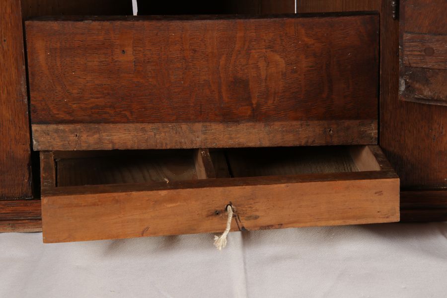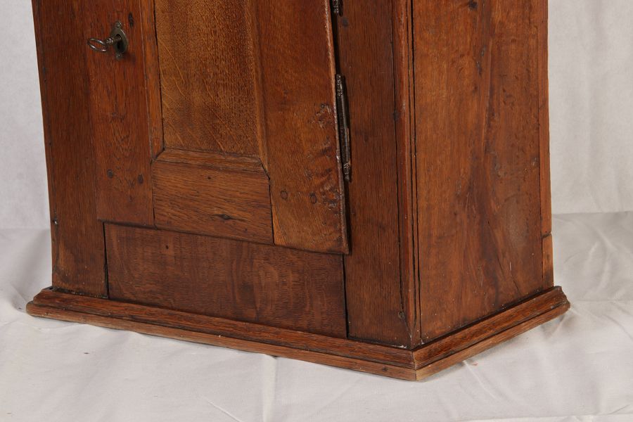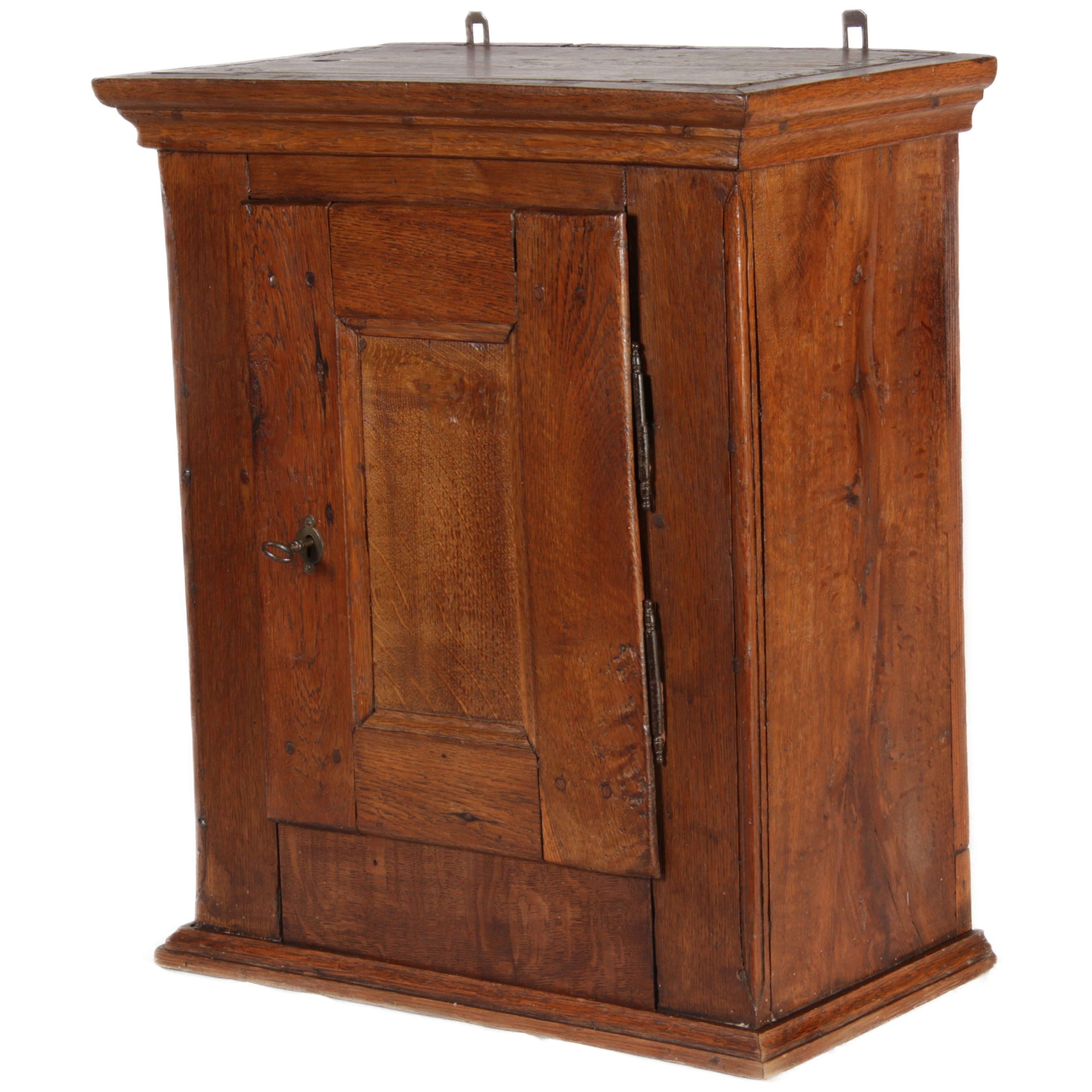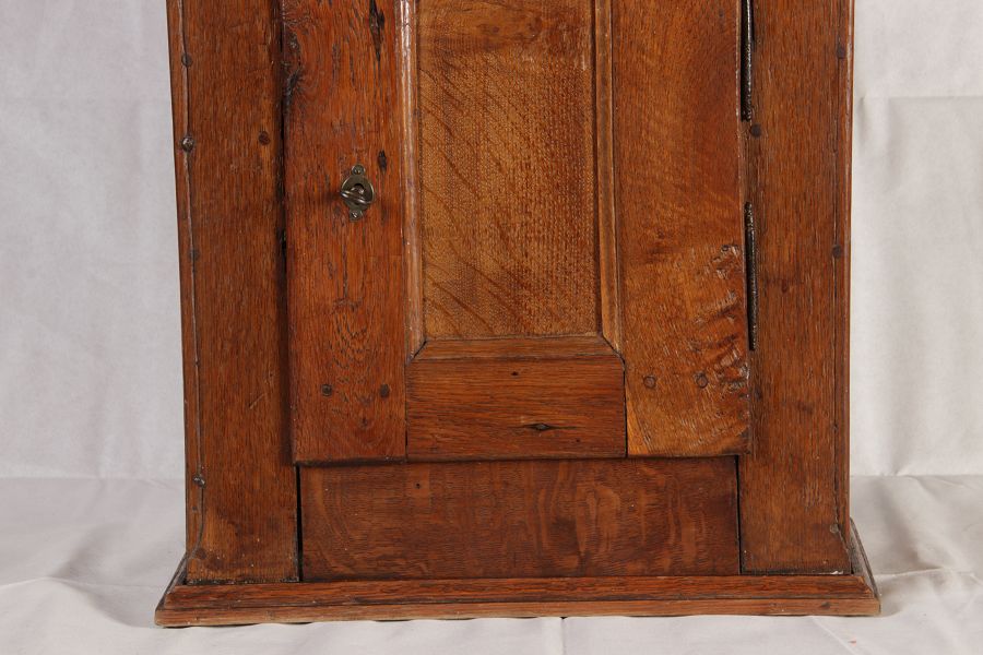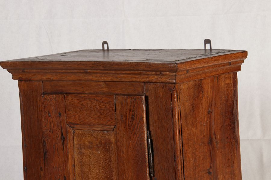 Masse/dimensions: Höhe/Height ca. 61 cm, Breite Korpus/Broad Boda ca. 47 cm, Breite Gesims/Broad cornice ca. 52 cm, Tiefe Korpus/Deep body ca. 24 cm, Tiefe Gesims/Deep cornice ca. 27 cm, Material/material Das Material ist Eiche, er hat 1 Schlüssel