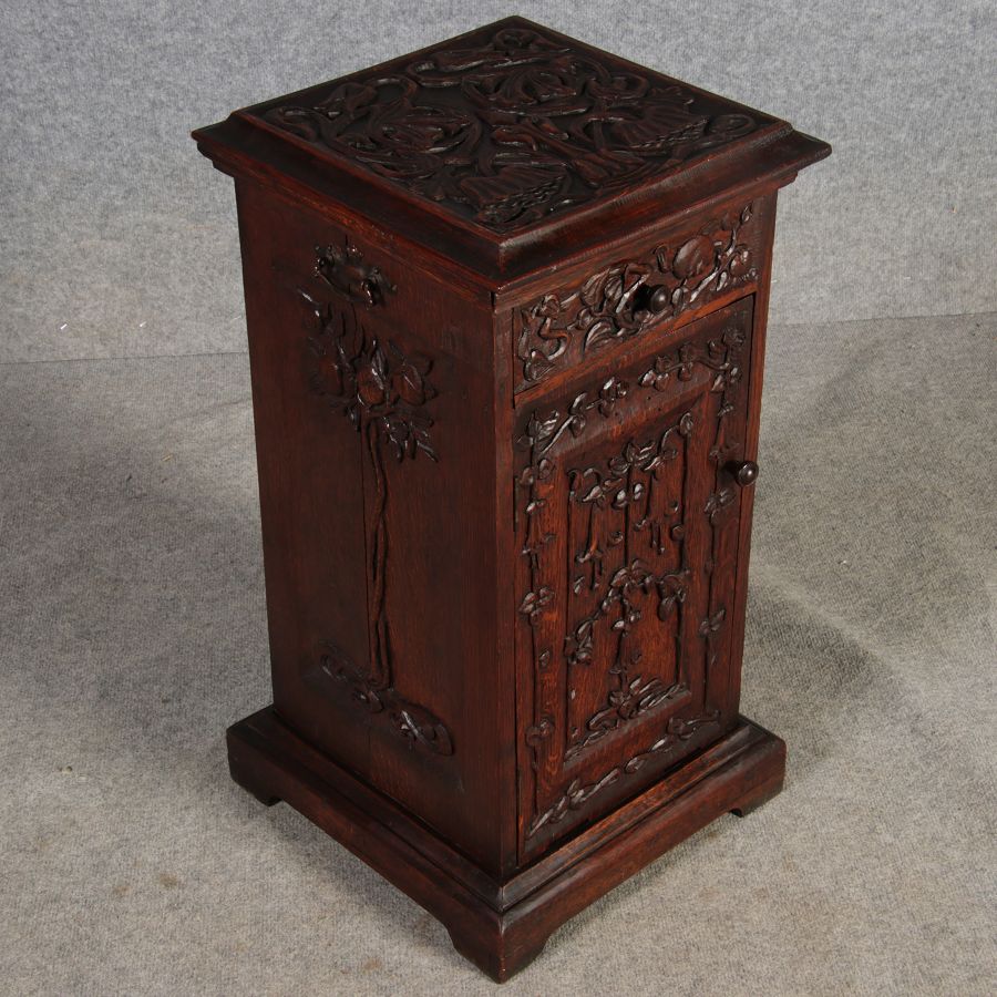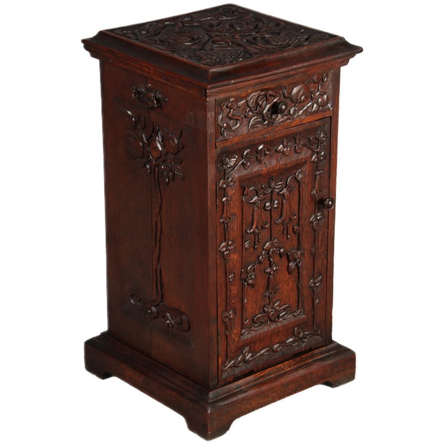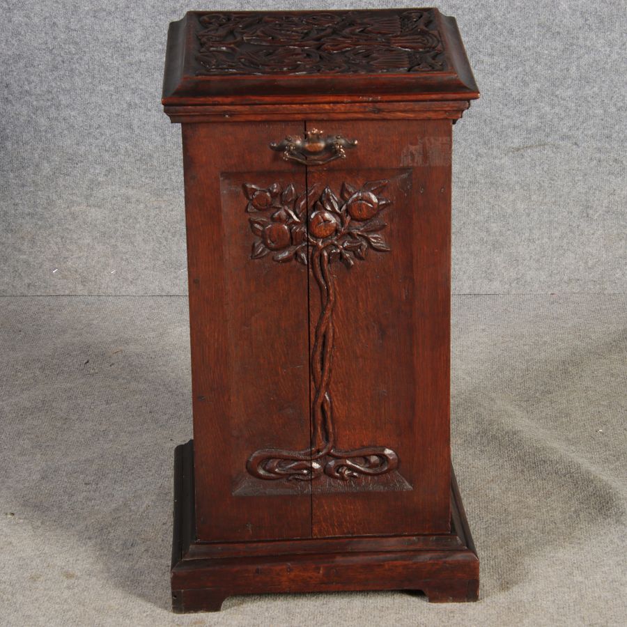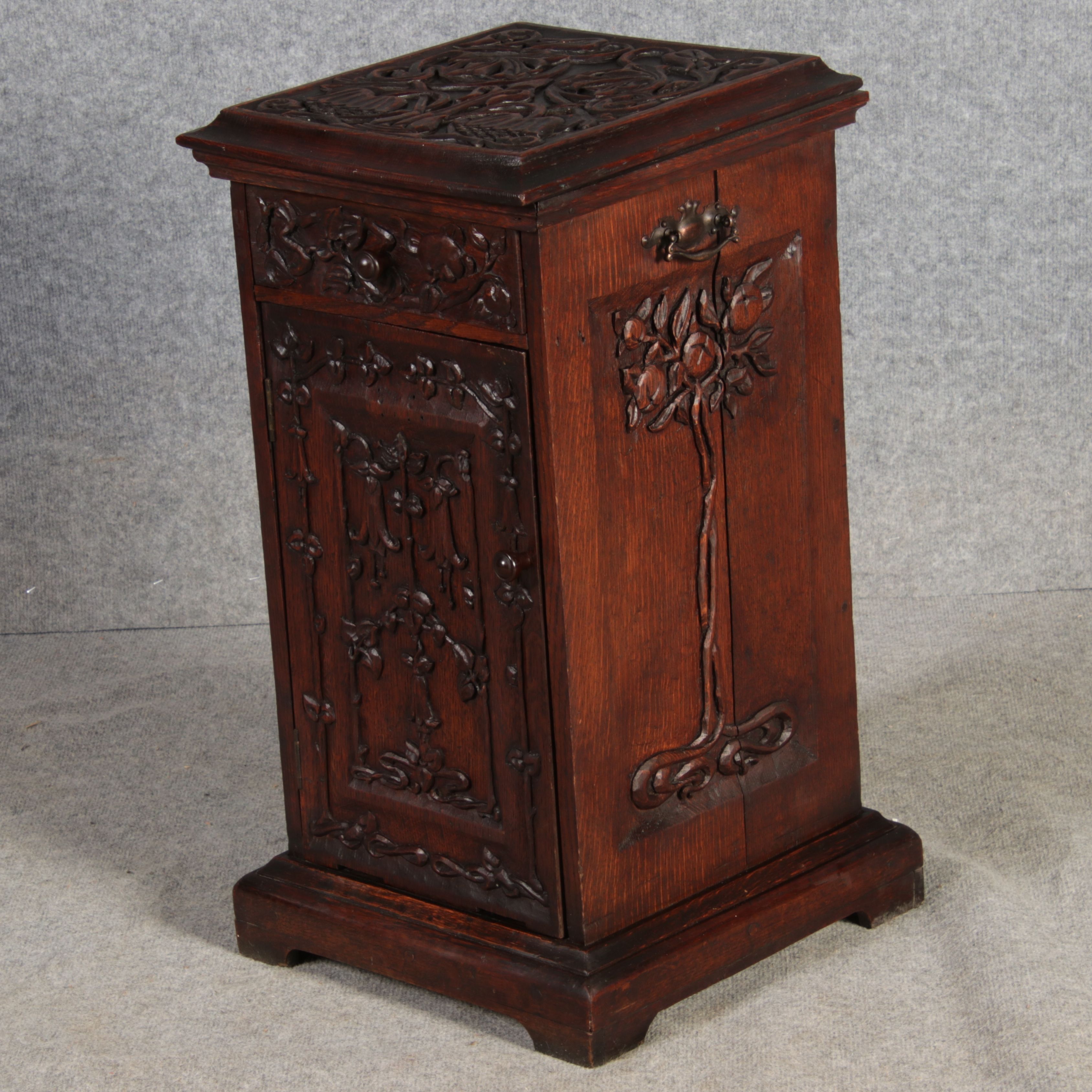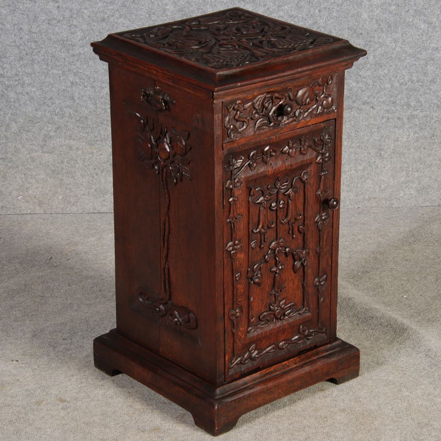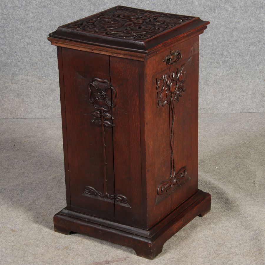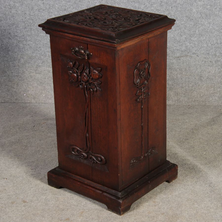 Antikes Jugendstiel Nachtschränkchen oder Podest, da man es frei in den Raum stellen kann. Es ist rundherum geschnitzt. Das Schränkchen ist aus Eiche und um 1900. |