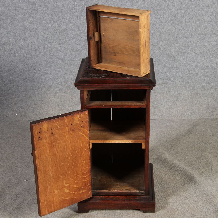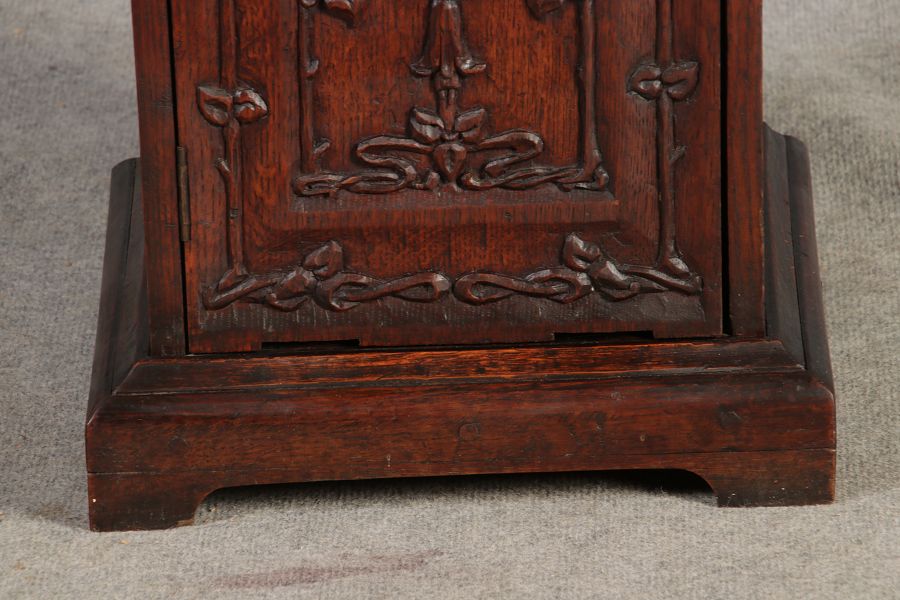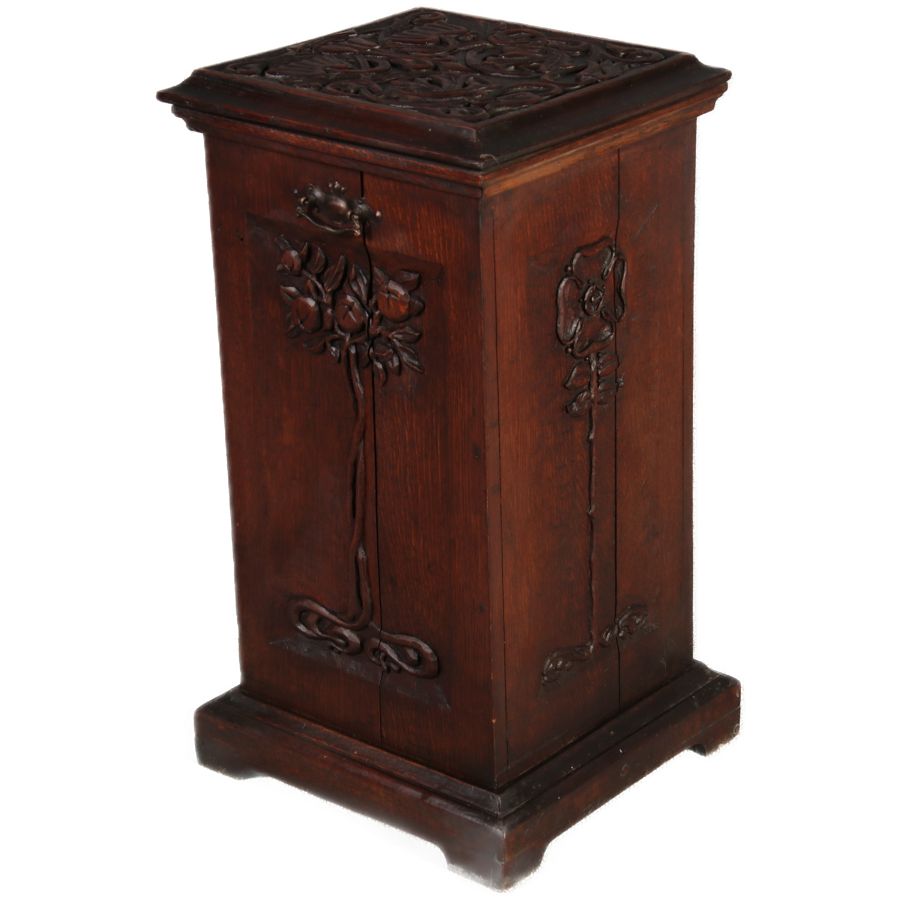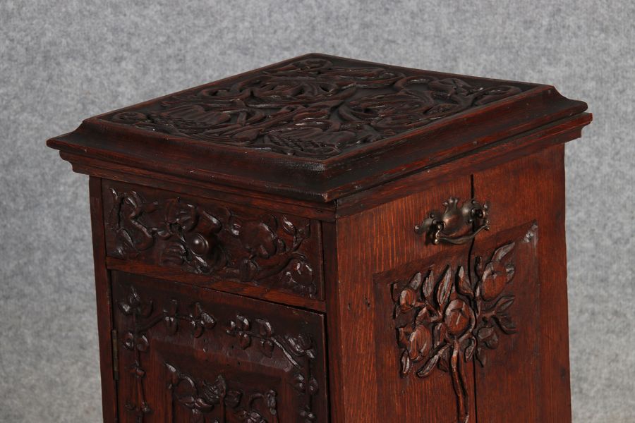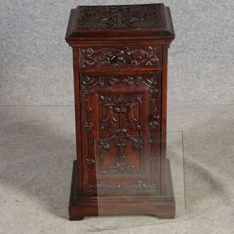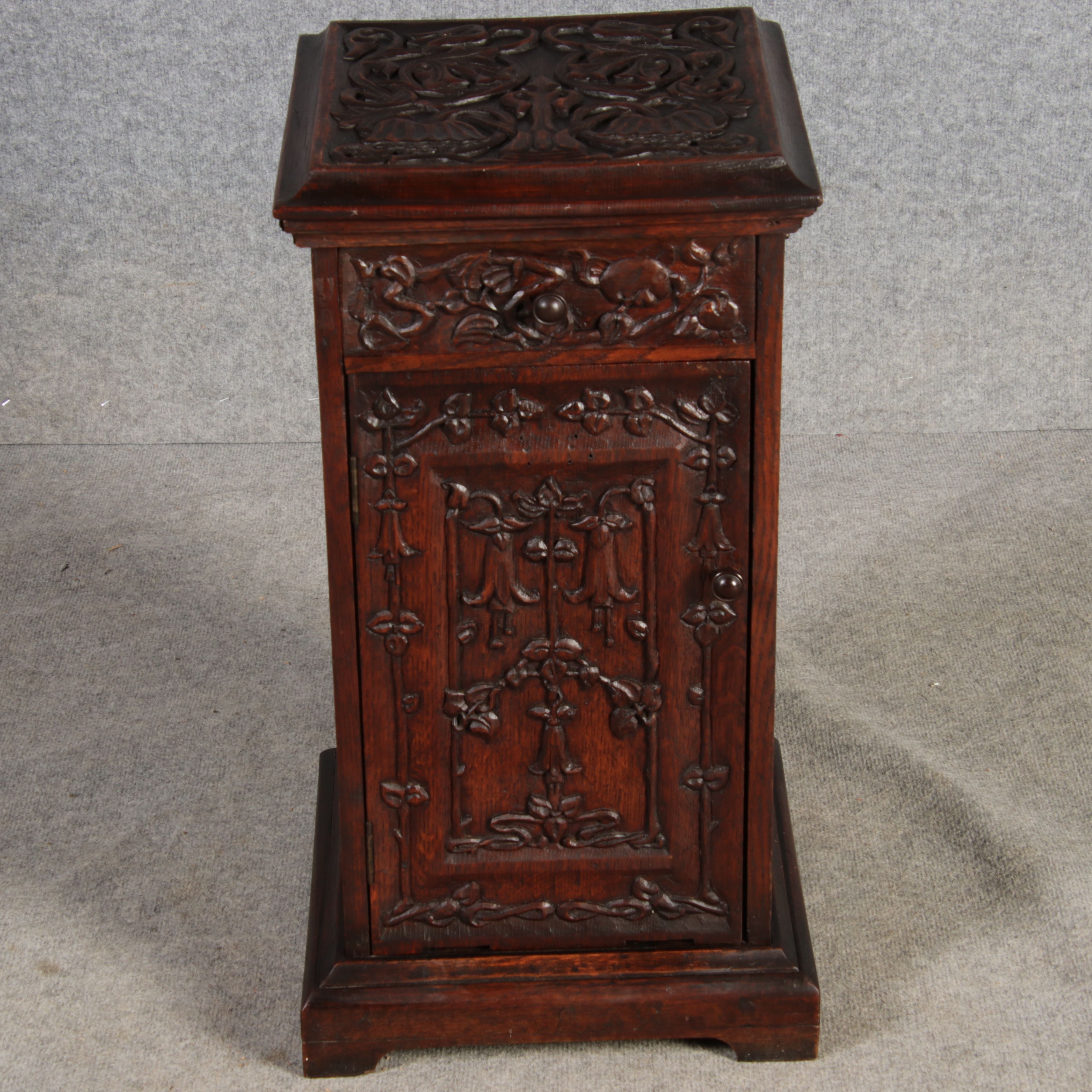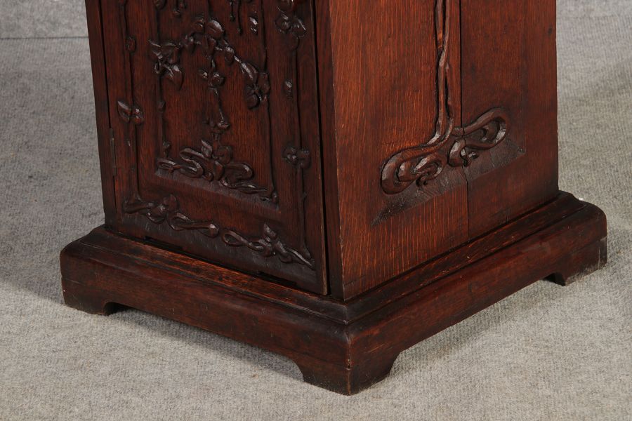 Antikes Jugendstiel Nachtschränkchen oder Podest, da man es frei in den Raum stellen kann. Es ist rundherum geschnitzt. Das Schränkchen ist aus Eiche und um 1900. |