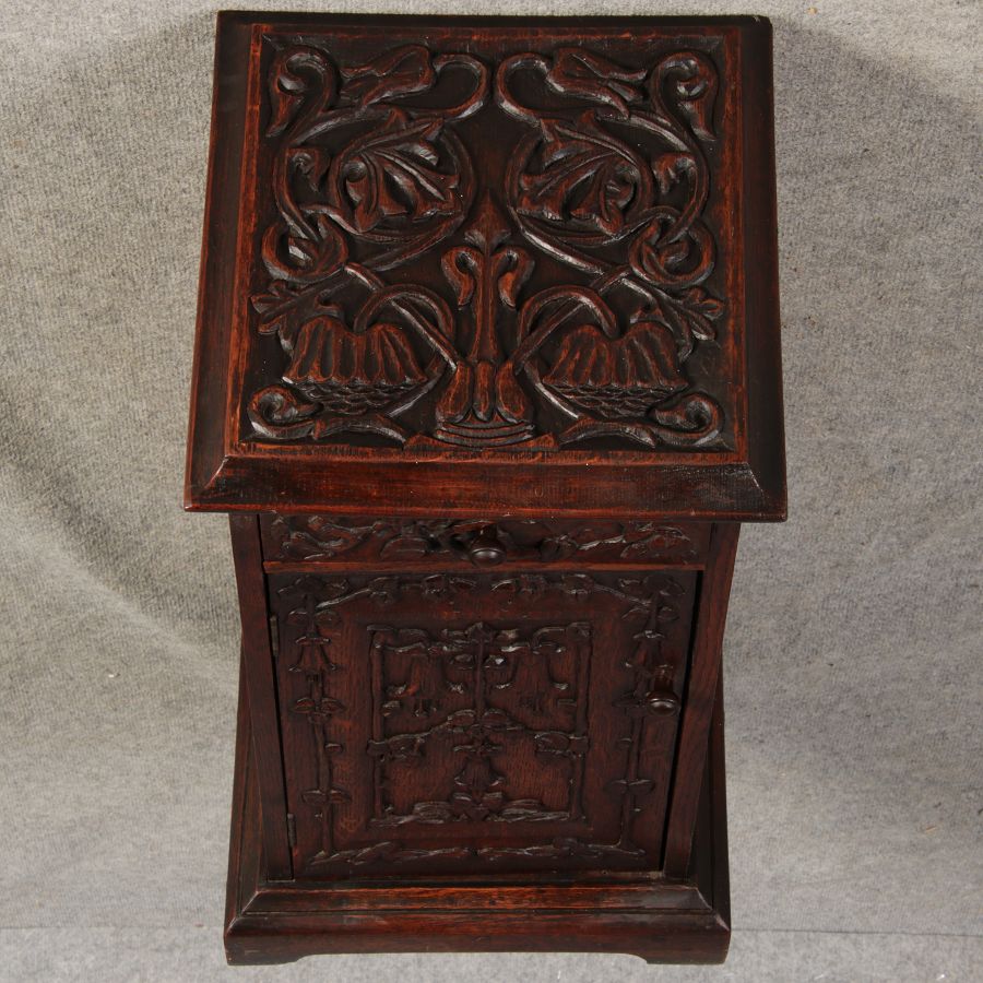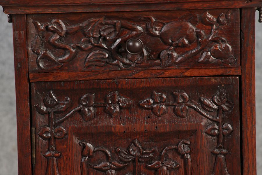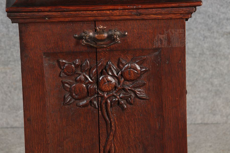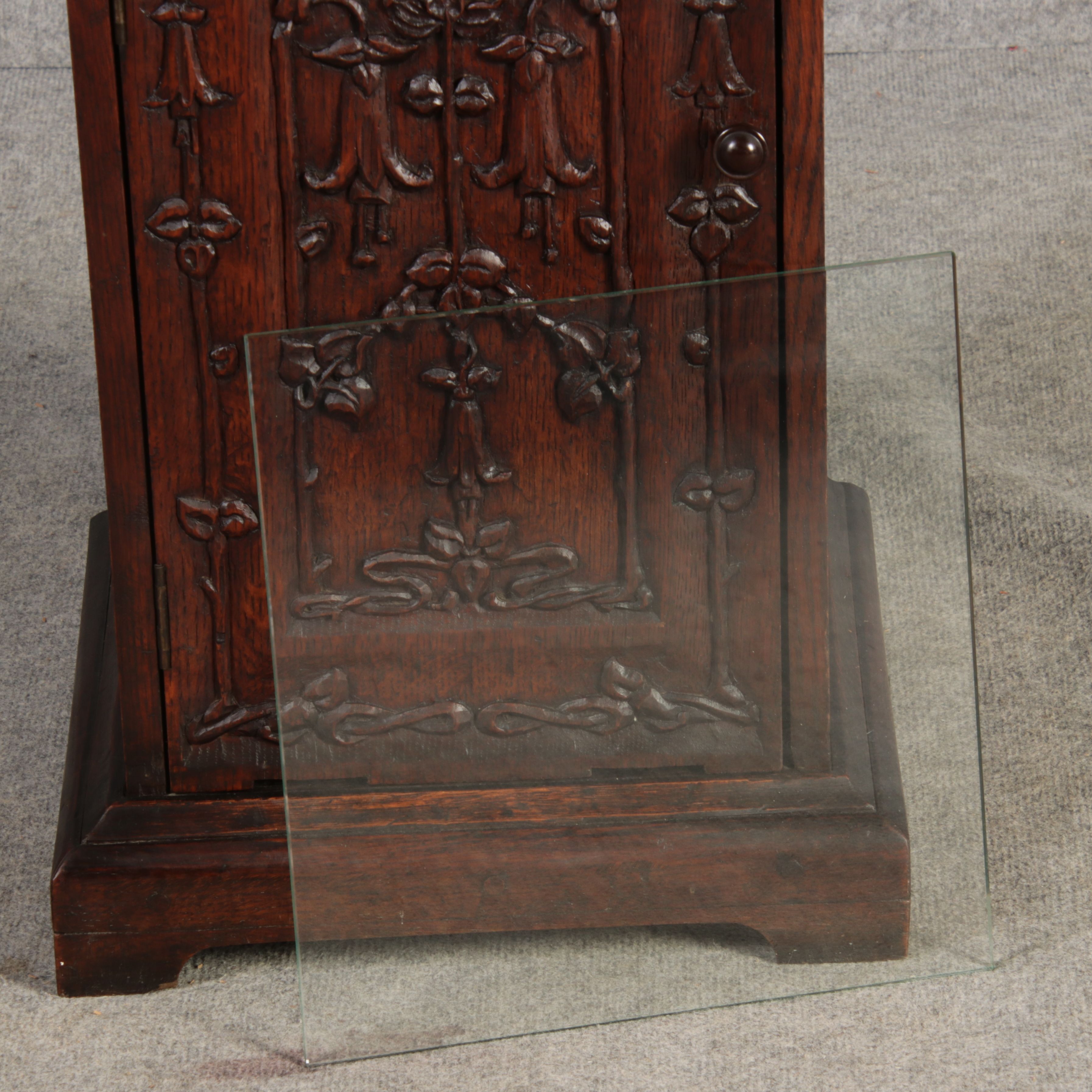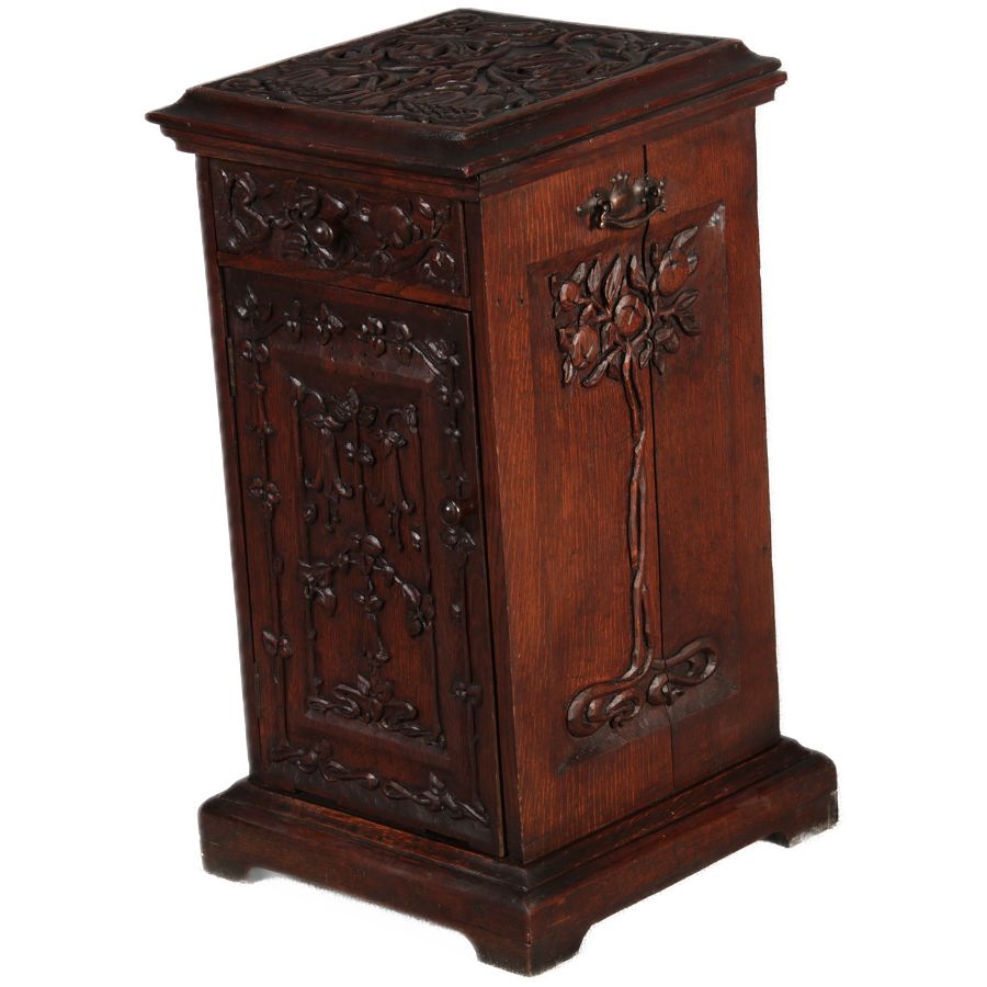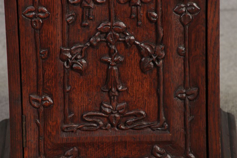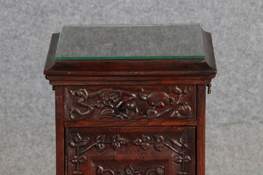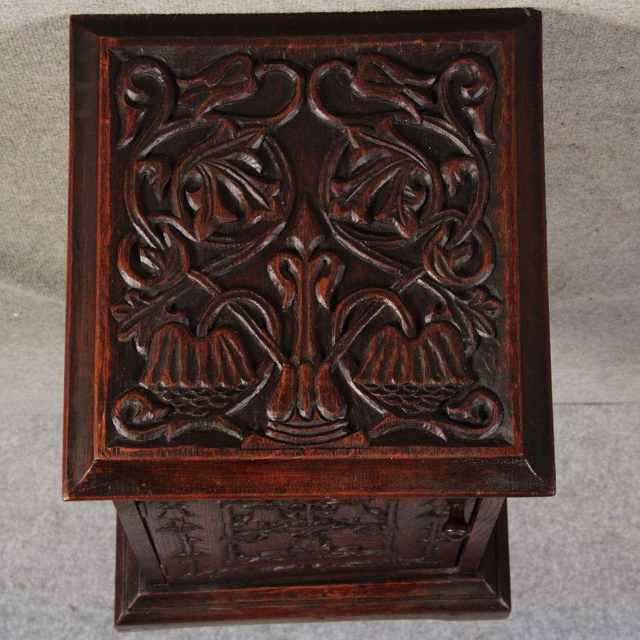 Antikes Jugendstiel Nachtschränkchen oder Podest, da man es frei in den Raum stellen kann. Es ist rundherum geschnitzt. Das Schränkchen ist aus Eiche und um 1900. |