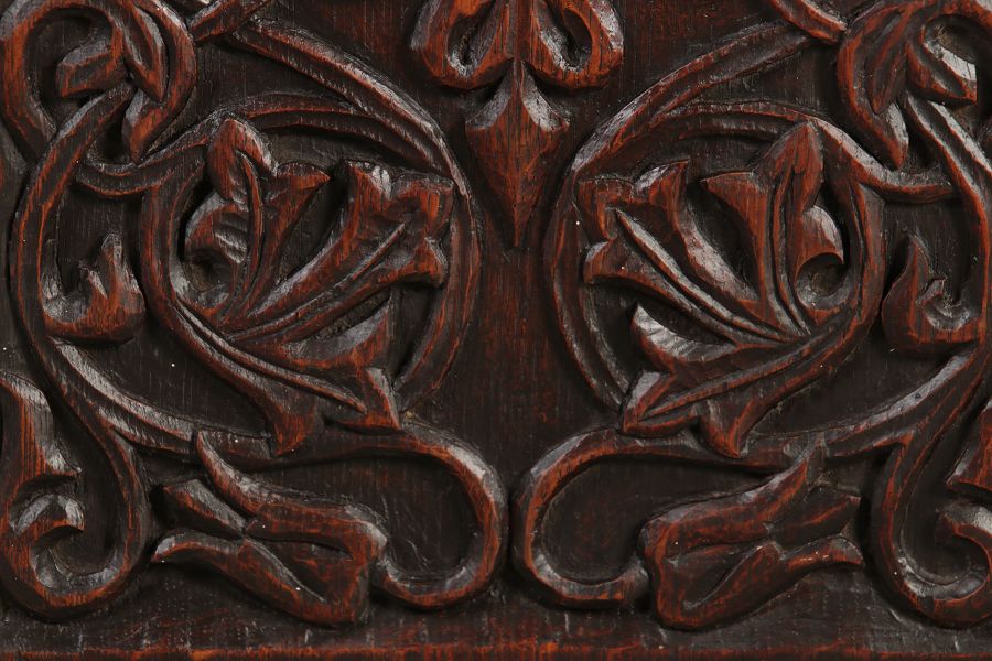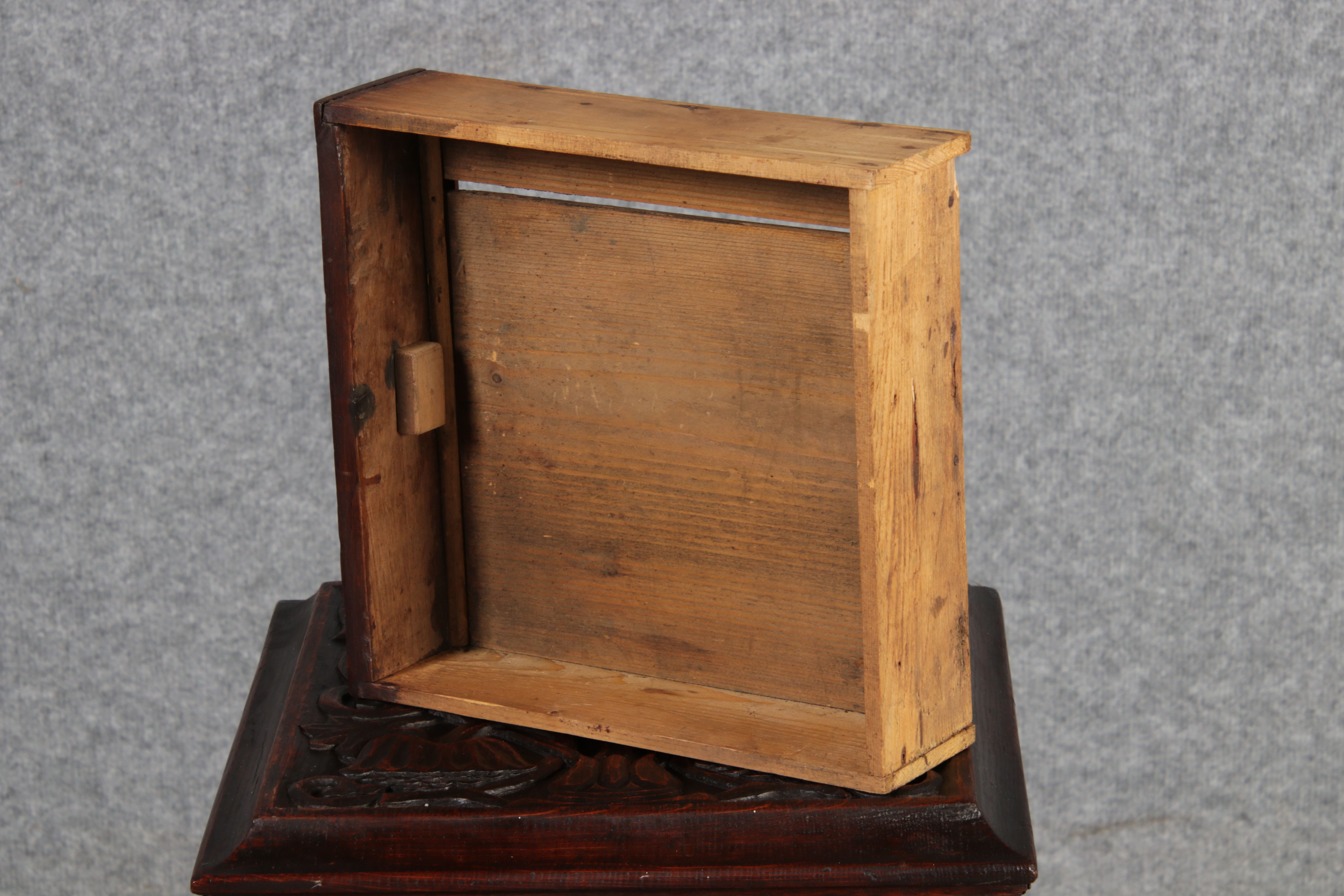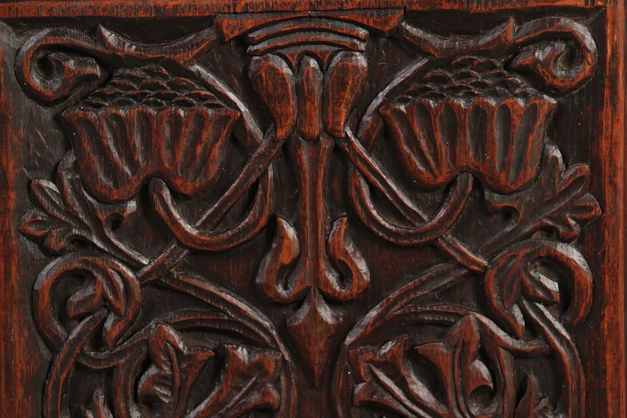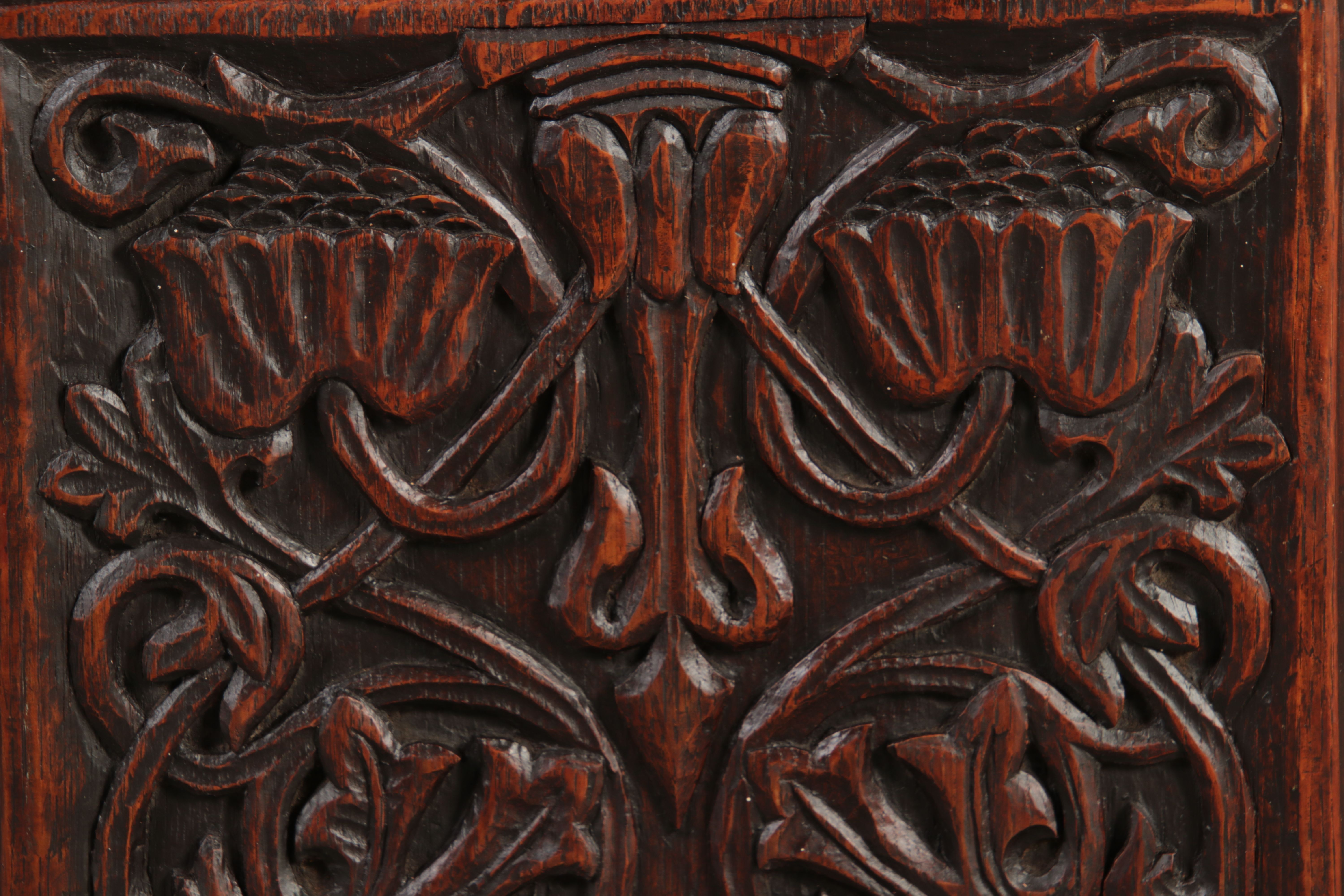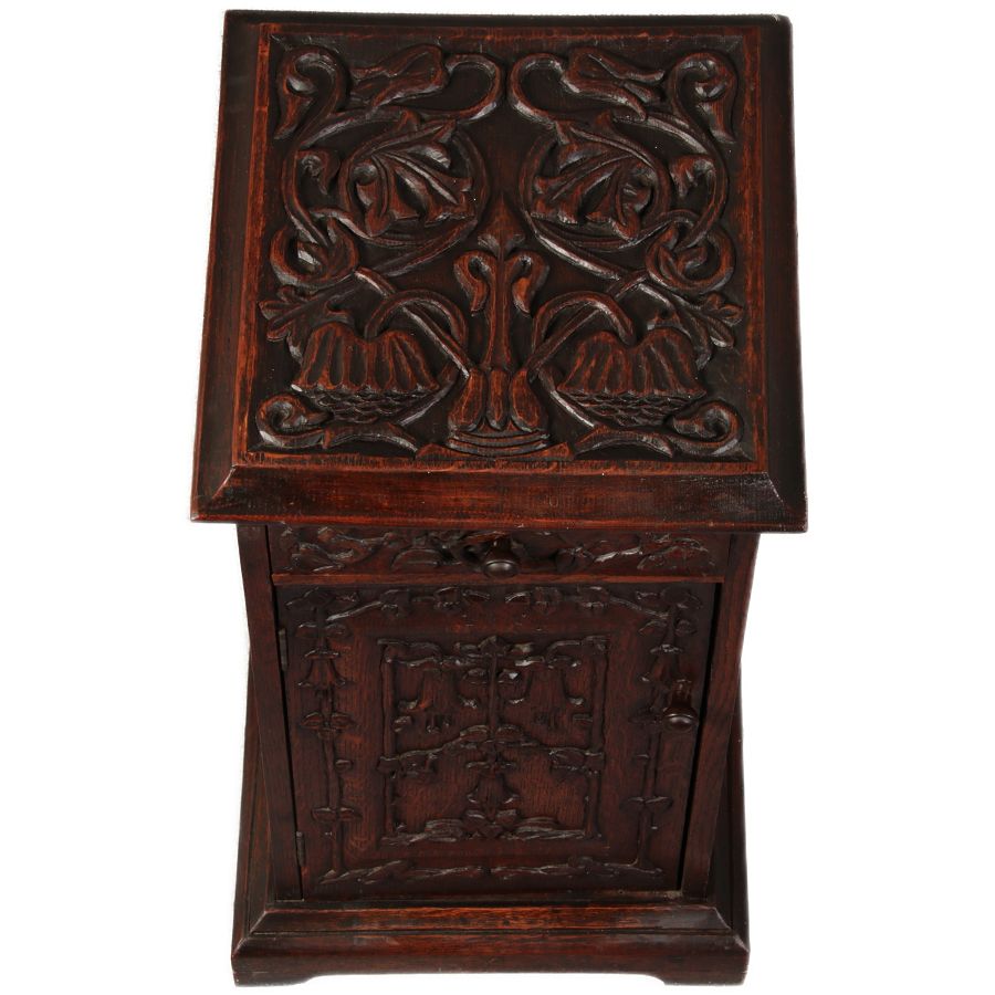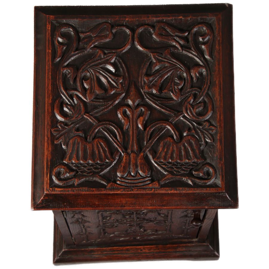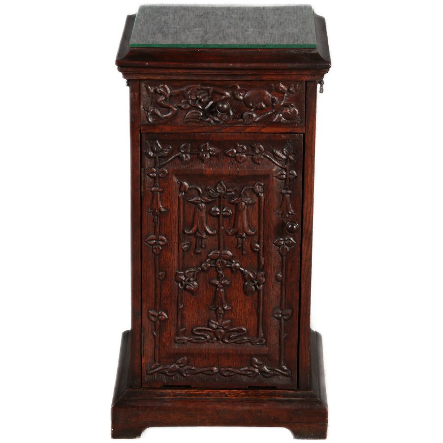 Antikes Jugendstiel Nachtschränkchen oder Podest, da man es frei in den Raum stellen kann. Es ist rundherum geschnitzt. Das Schränkchen ist aus Eiche und um 1900. |