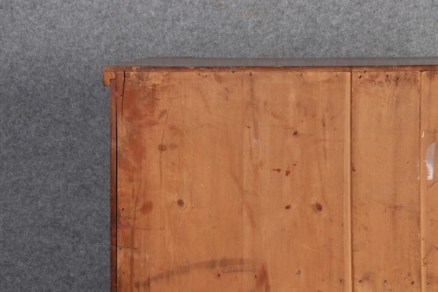 Alle Schubladenfronten sind mit ausgesuchten Mahagoni mit feinster Maserung furniert. Diese schöne große Kommode befindet sich in einem für das alter guten Zustand mit Gebrauchsspuren und kleinen Beschädigungen, die dem Alter und der Verwendung entsprechen. |