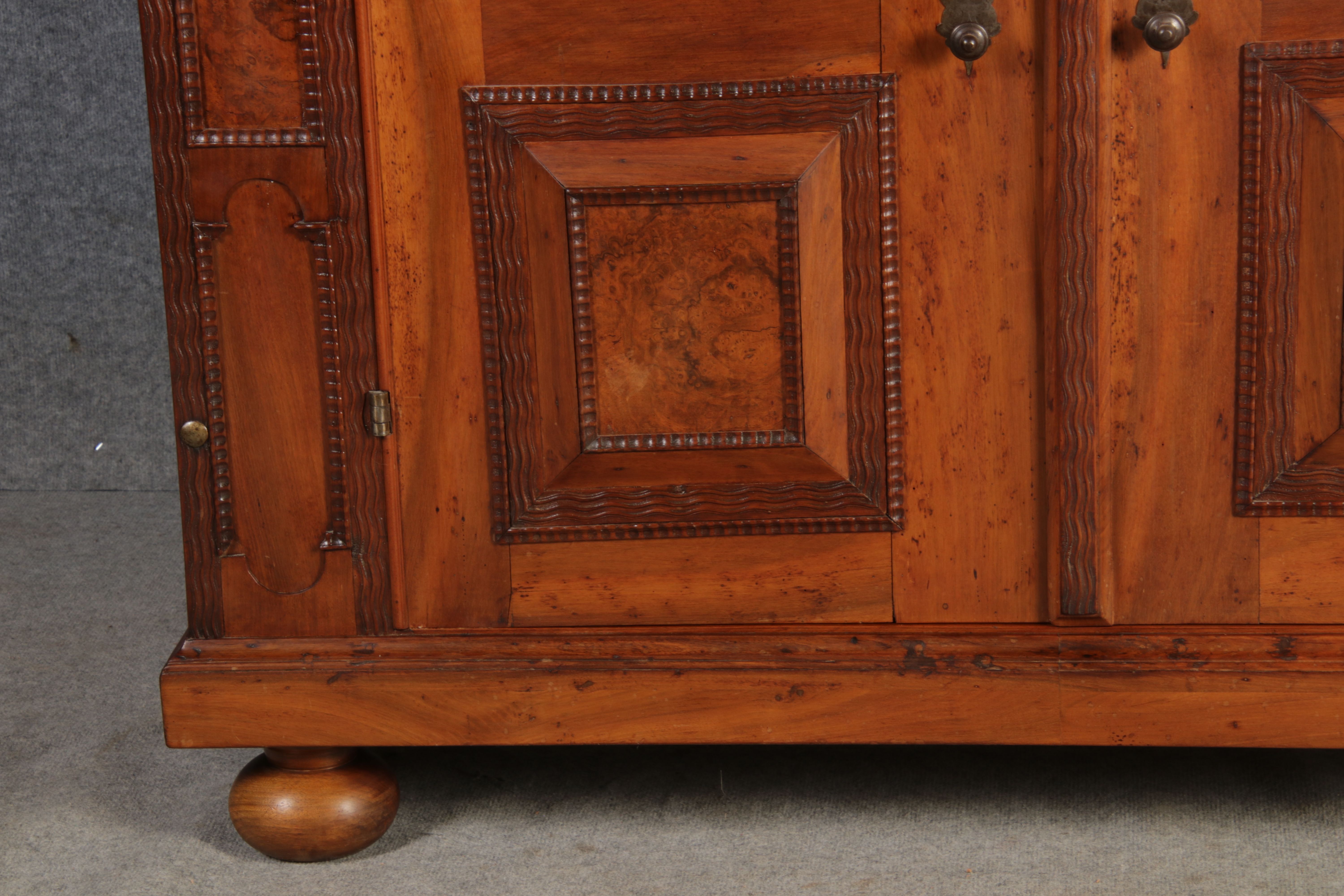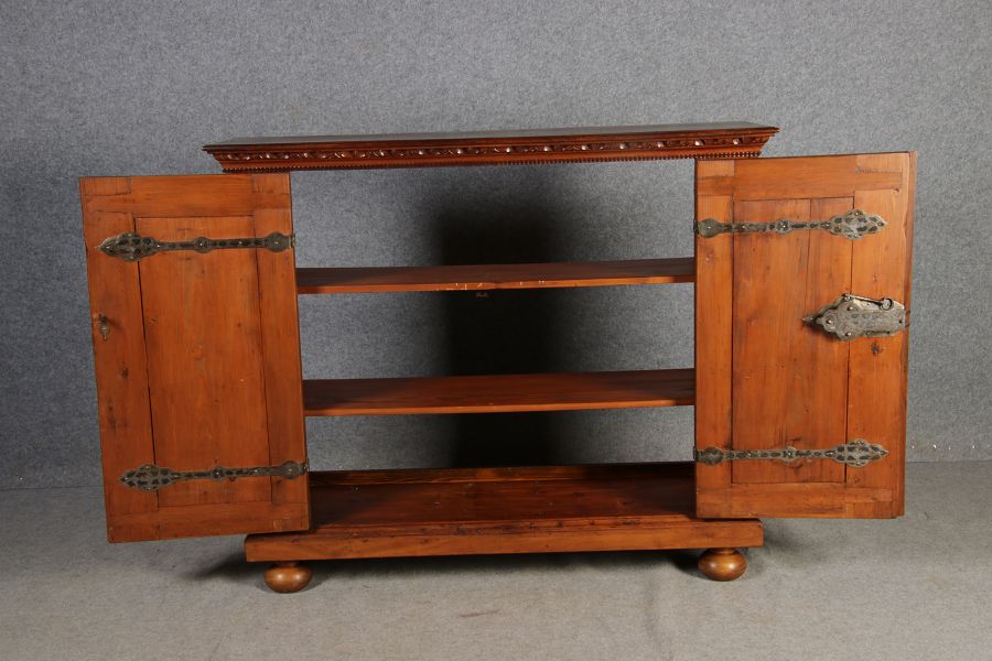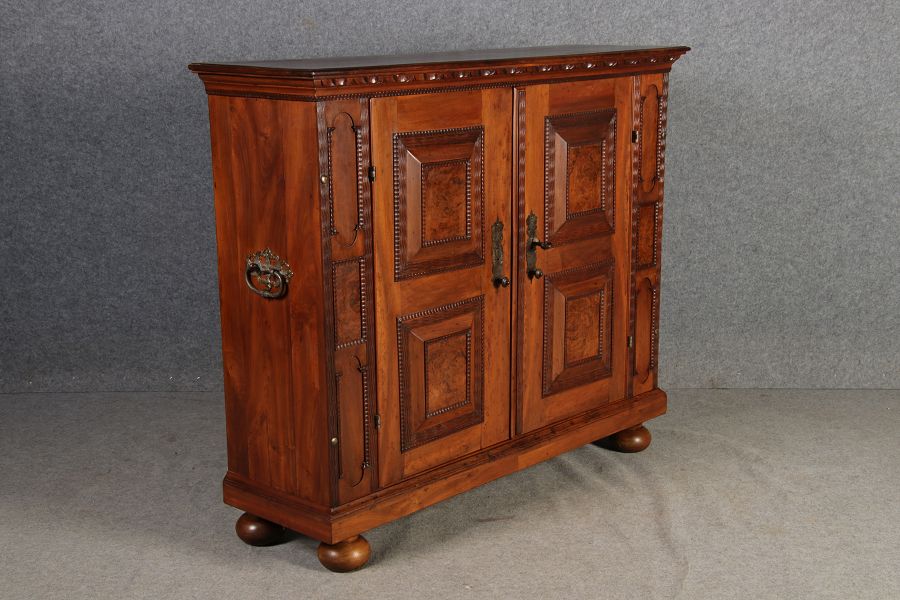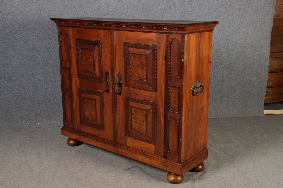 Antiker Renaissance Früh Barock Fassaden Halbschrank 17 Jh. Nussbaum. Schönes seltenes Stück ideal im Flur oder als etwas höhere Anrichte. Wurde als Fernseheschrank benutzt, deshalb fehlt die Rückwand, die vor Auslieferung noch ergänzt wird. |