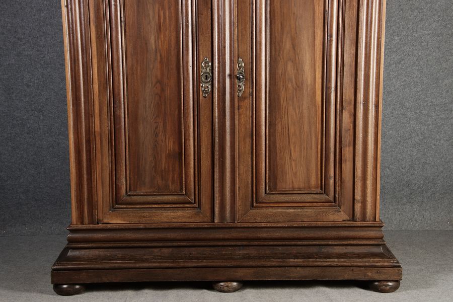 Antiker sehr hoher Frankfurter Barock Wellenschrank Eiche massiv aus dem 18 Jh. Der Schrank stand im Fränkischen Kloster Maria Hilf und wurde dort als Garderobenschrank genutzt. Der Schrank wurde innen von einem Schreiner mit neuen Sperrholz Platten ausgeschlagen, damit er innen ein sauberes Erscheinungsbild hat. Durch seine Höhe von 241 cm hat er ein Dominates Erscheinungsbild und ist in jedem Raum ein besonderes Stück. |