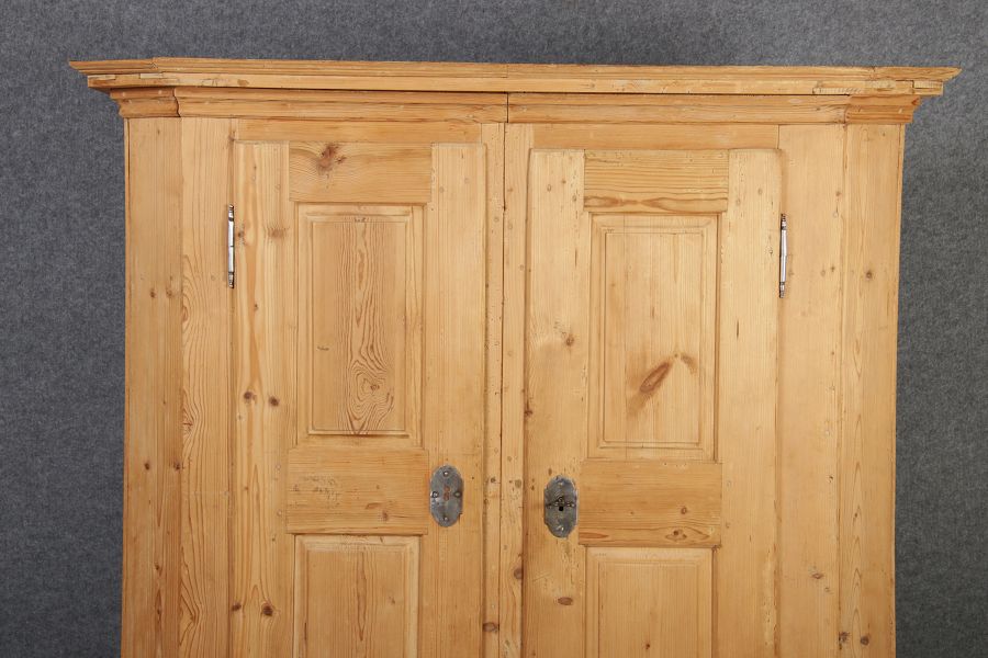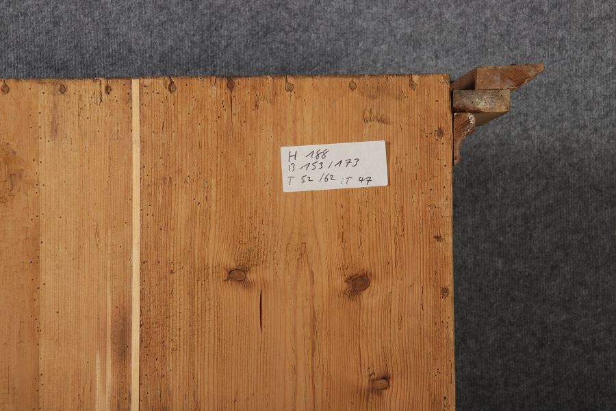 Masse/dimensions: Höhe/Height ca. 188 cm, Breite Korpus/Broad Boda ca. 153 cm, Breite Gesims/Broad cornice ca. 173 cm, Tiefe Korpus/Deep body ca. 52 cm, Tiefe Gesims/Deep cornice ca. 62 cm,