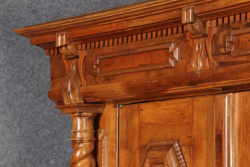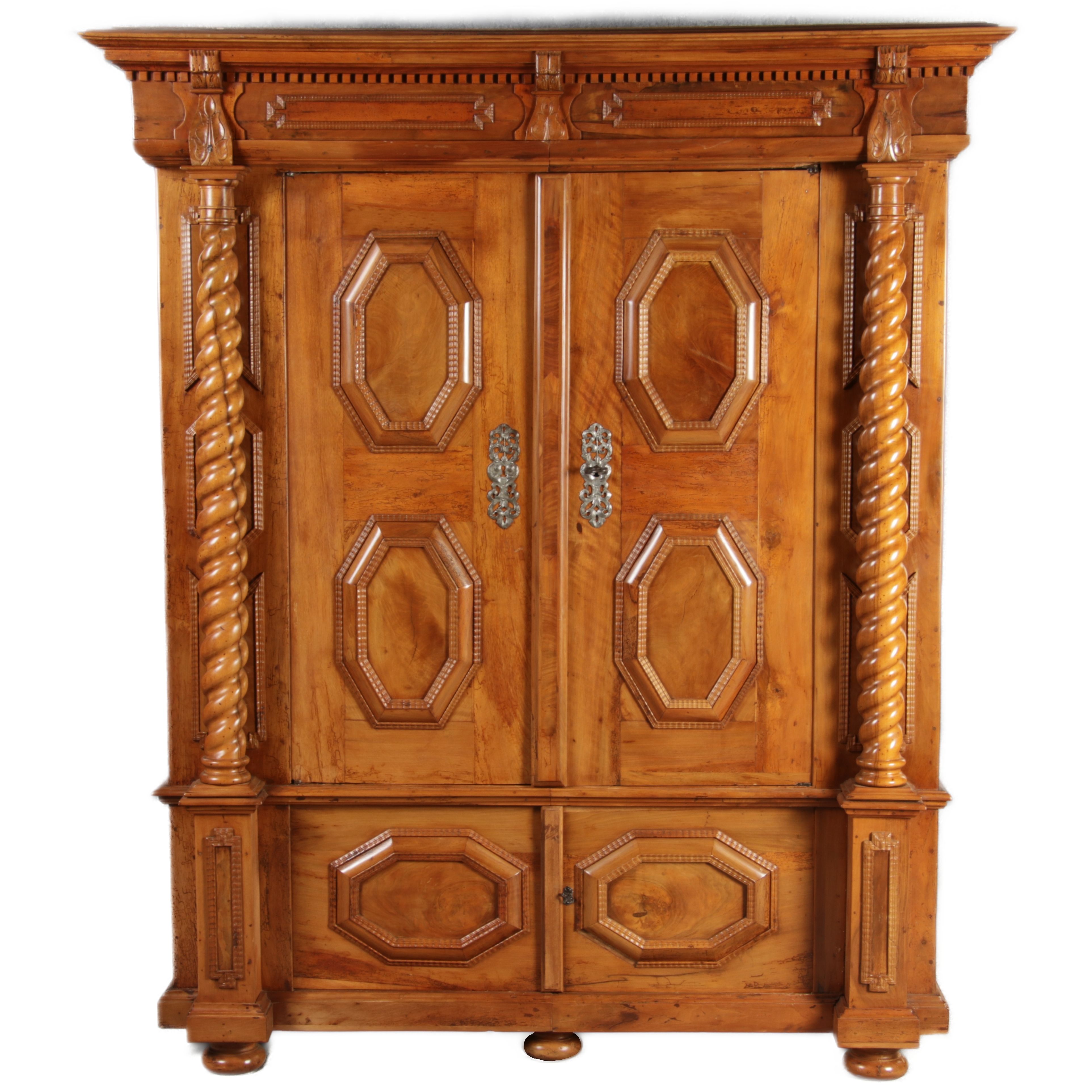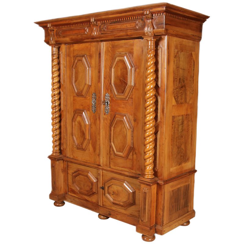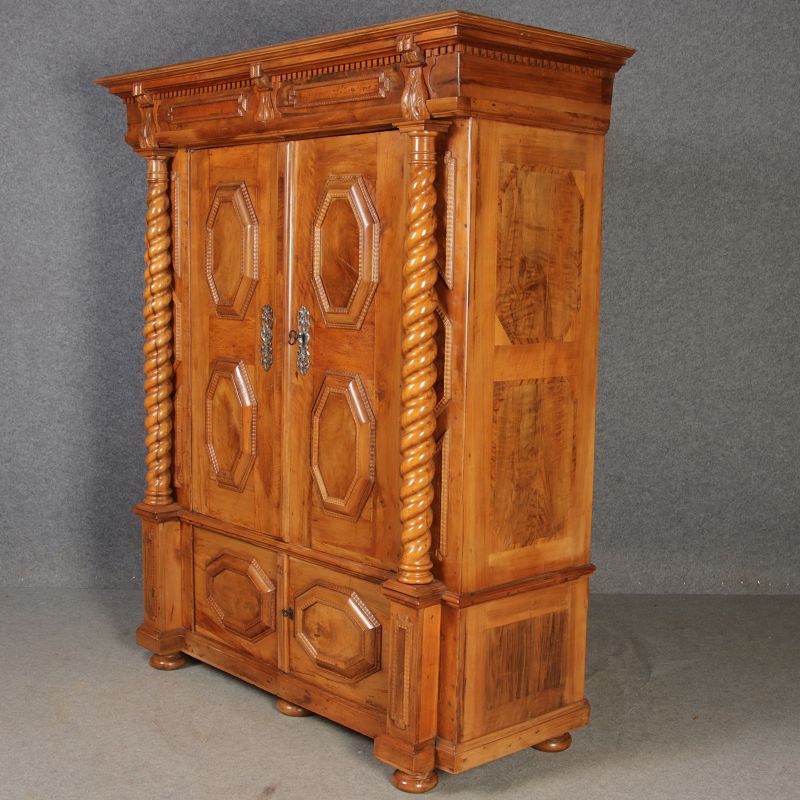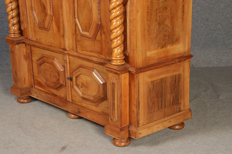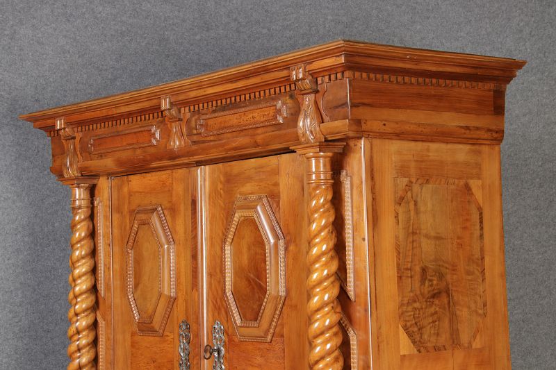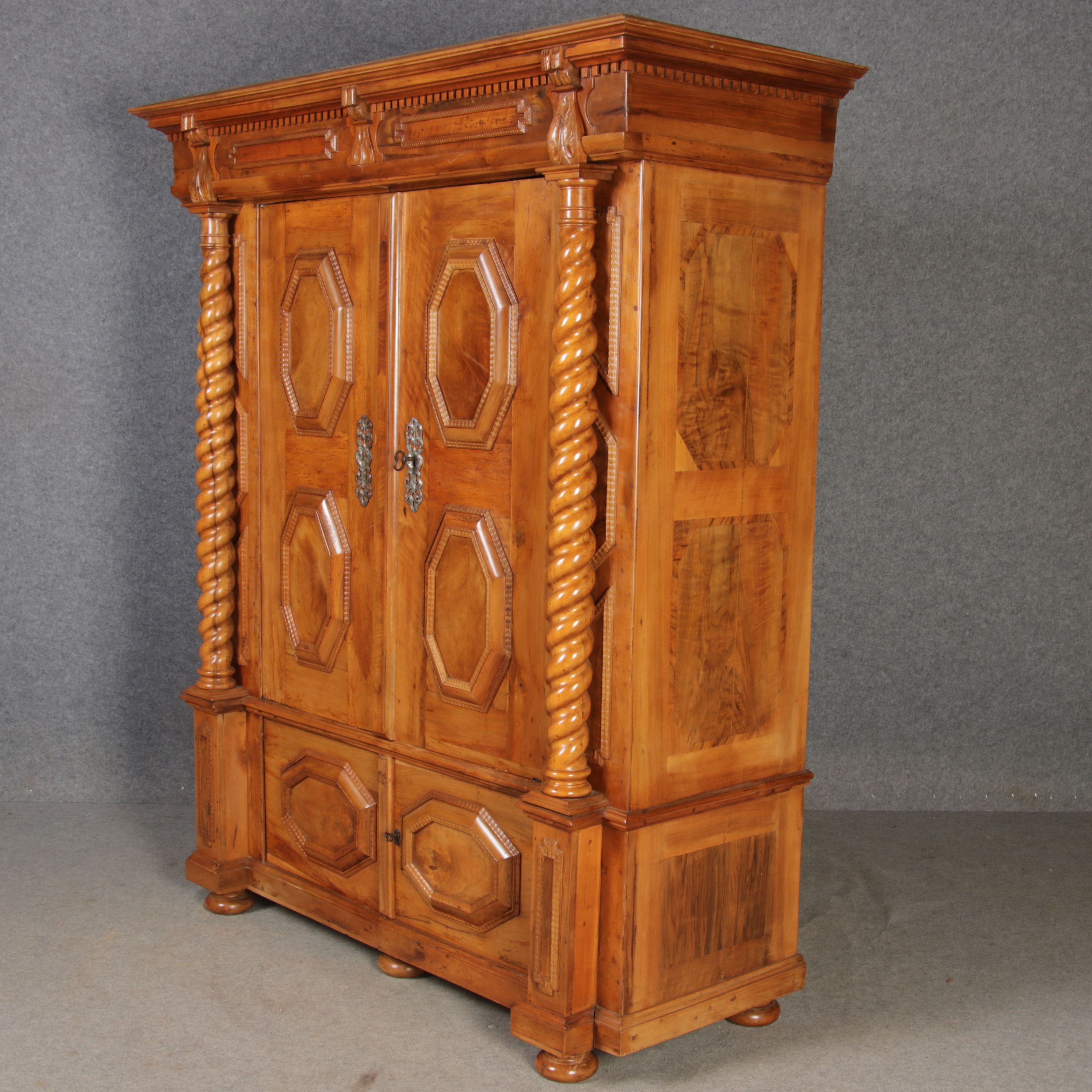 Antiker spät Renaissance früh Barock Schrank um 1700 Nussbaum mit Korkenzieher Säulen |