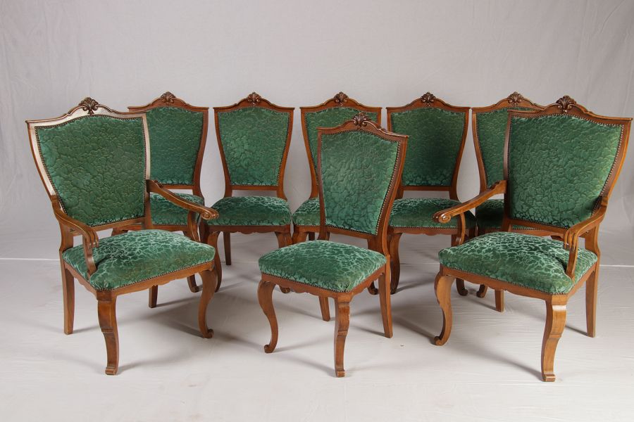 Beschreibung/description: Antiker Achtersatz Stühle 2 Sesel und 6 Stühle. Viktorianisch zweite Hälfte 19 Jh. Nussbaum.